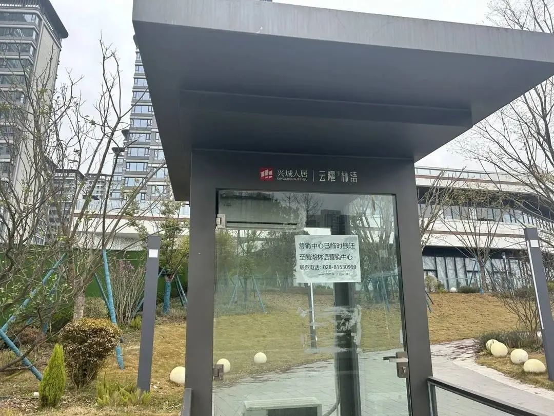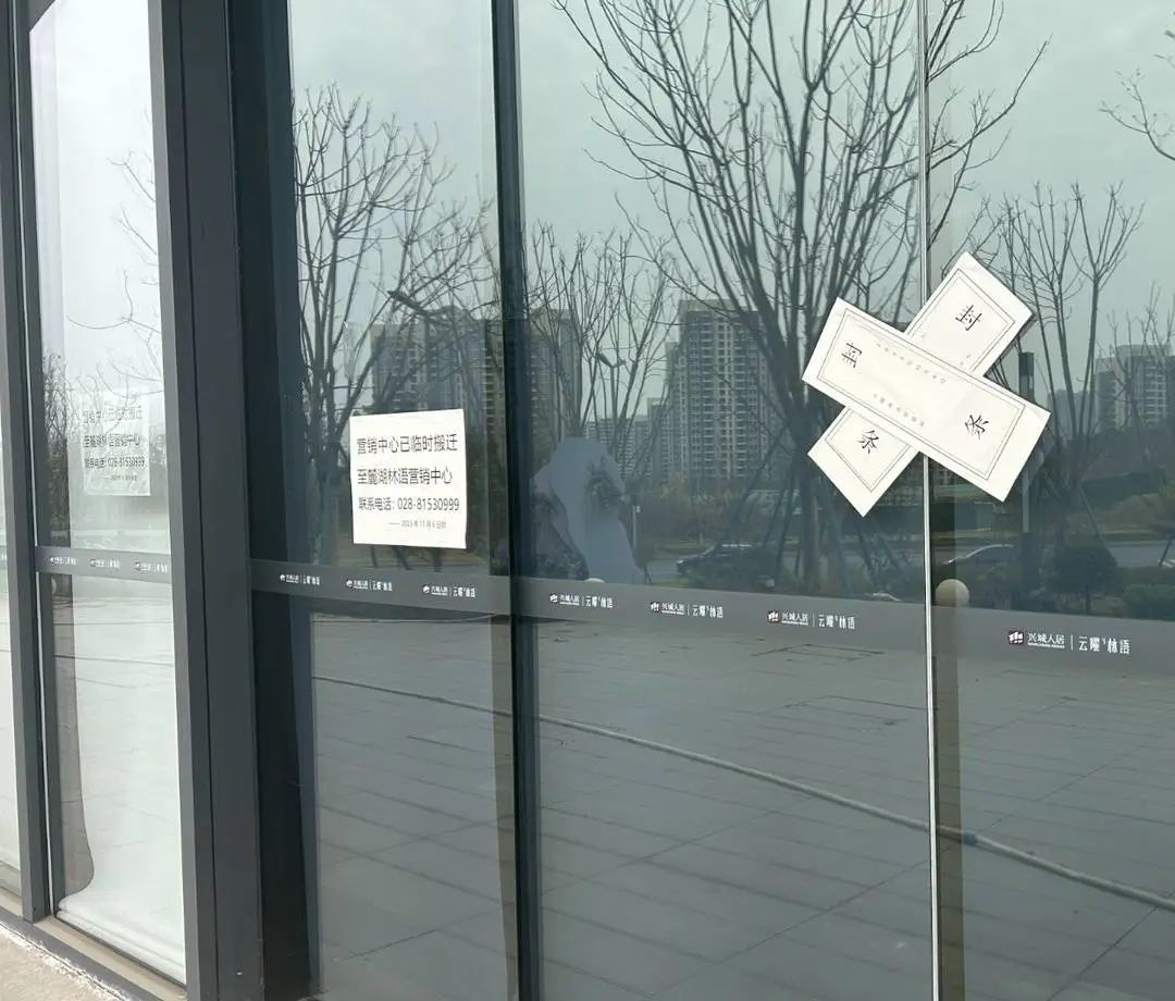 3月19日,记者来到位于成都市煎茶街道五里社区2组199号的人居云曜林语,看到售楼部大门紧闭,门口张贴着“营销中心已临时搬迁至麓湖林语营销中心”的告知条,时间显示为2023年11月6日封。