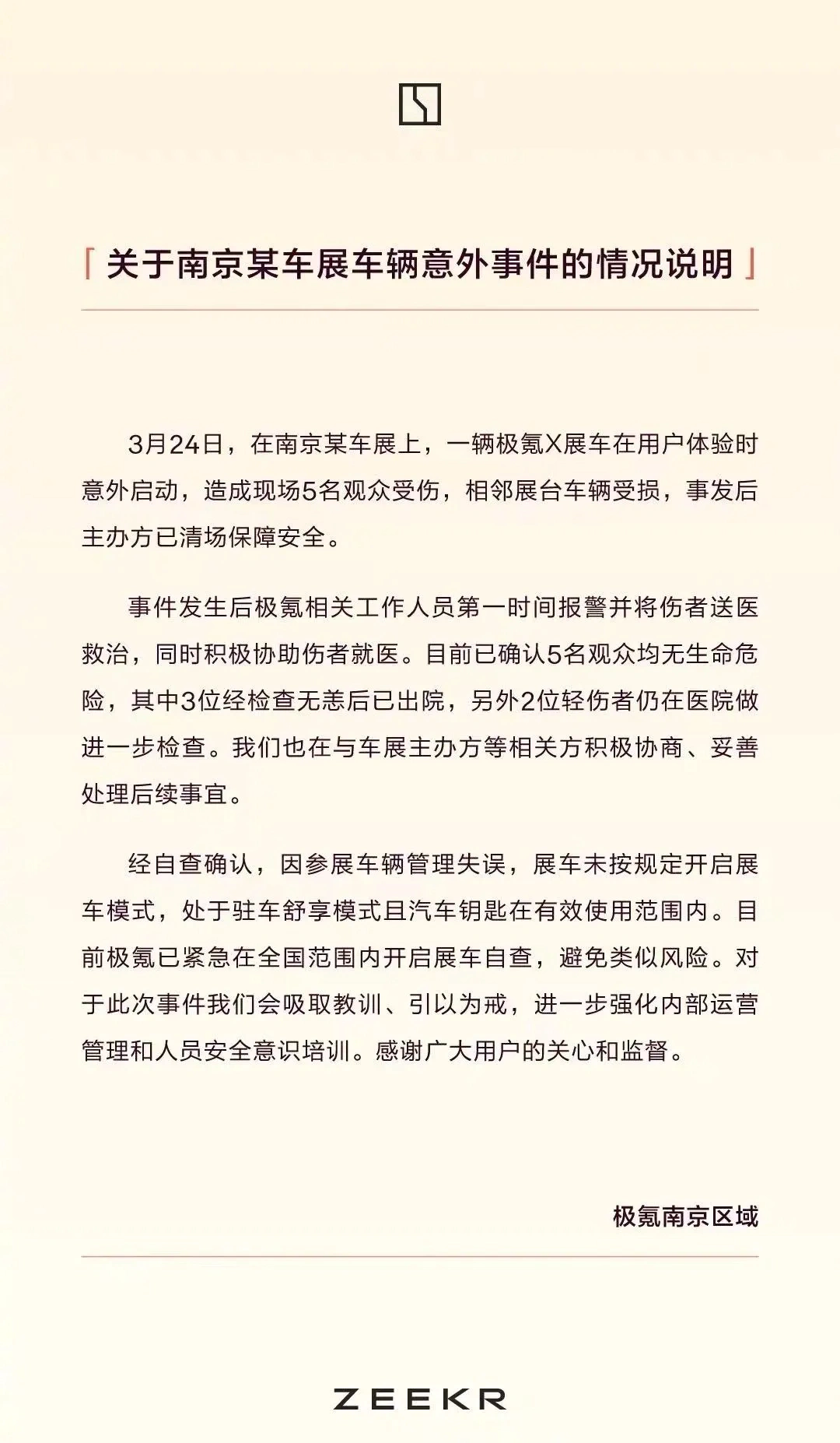 3月24日,极氪南京区域发布情况说明,详情如下: