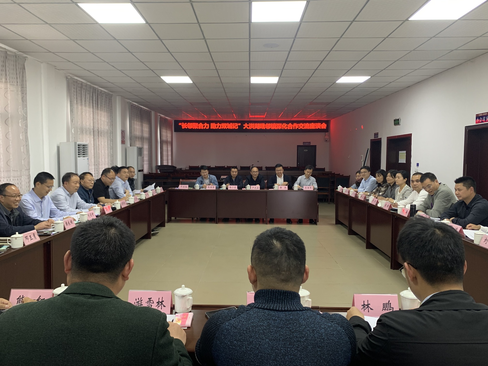 图为2023年4月,广安市邻水县九龙镇、黎家镇、御临镇和重庆市长寿区万顺镇、洪湖镇正围绕毗邻地区深化合作进行交流座谈。