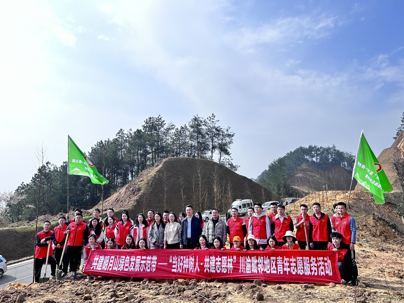 图为2023年3月,川渝两地志愿者在位于川渝交界地带的明月山开展“当好种树人 共建志愿林”川渝毗邻地区青年志愿服务活动。