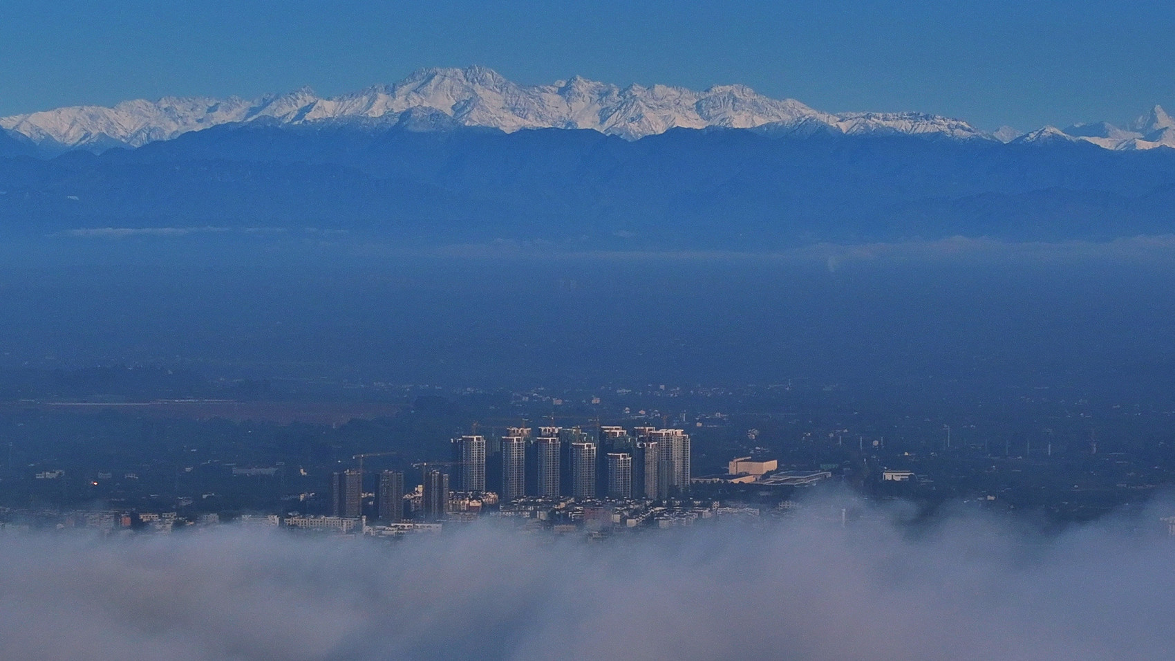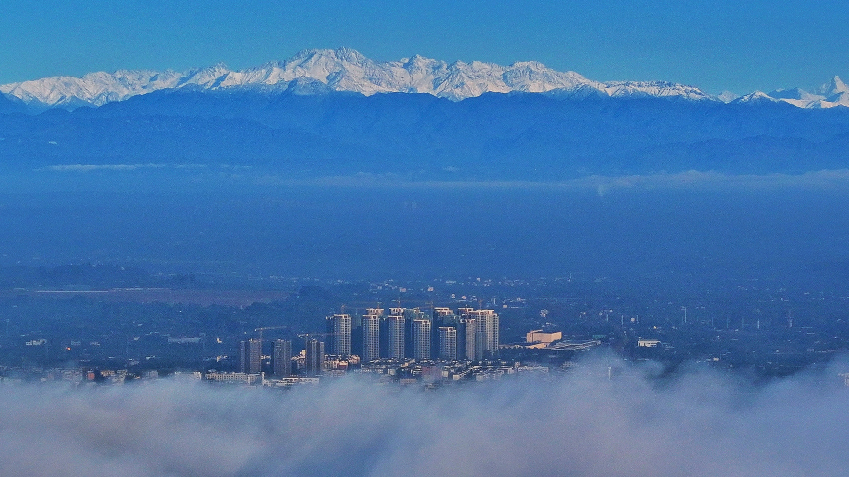 从蒲江县向西眺望,远处的山脉清晰可见,连绵起伏的雪山,让蒲江的春光更显几分波澜壮阔。
