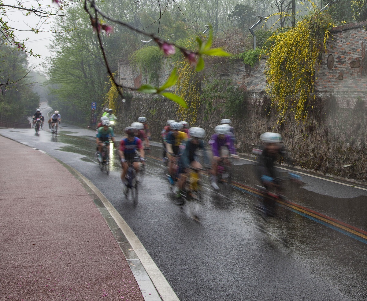 “今天下雨,道路湿滑,特别是在下坡路段,请各位选手一定要注意安全。”在每一组出发前,工作人员都会拿着喇叭不断提醒参赛选手注意比赛安全。