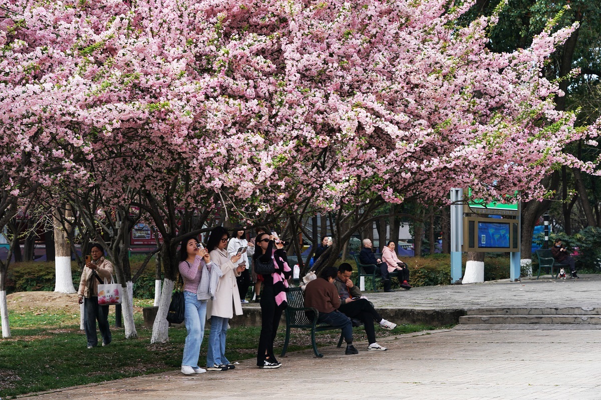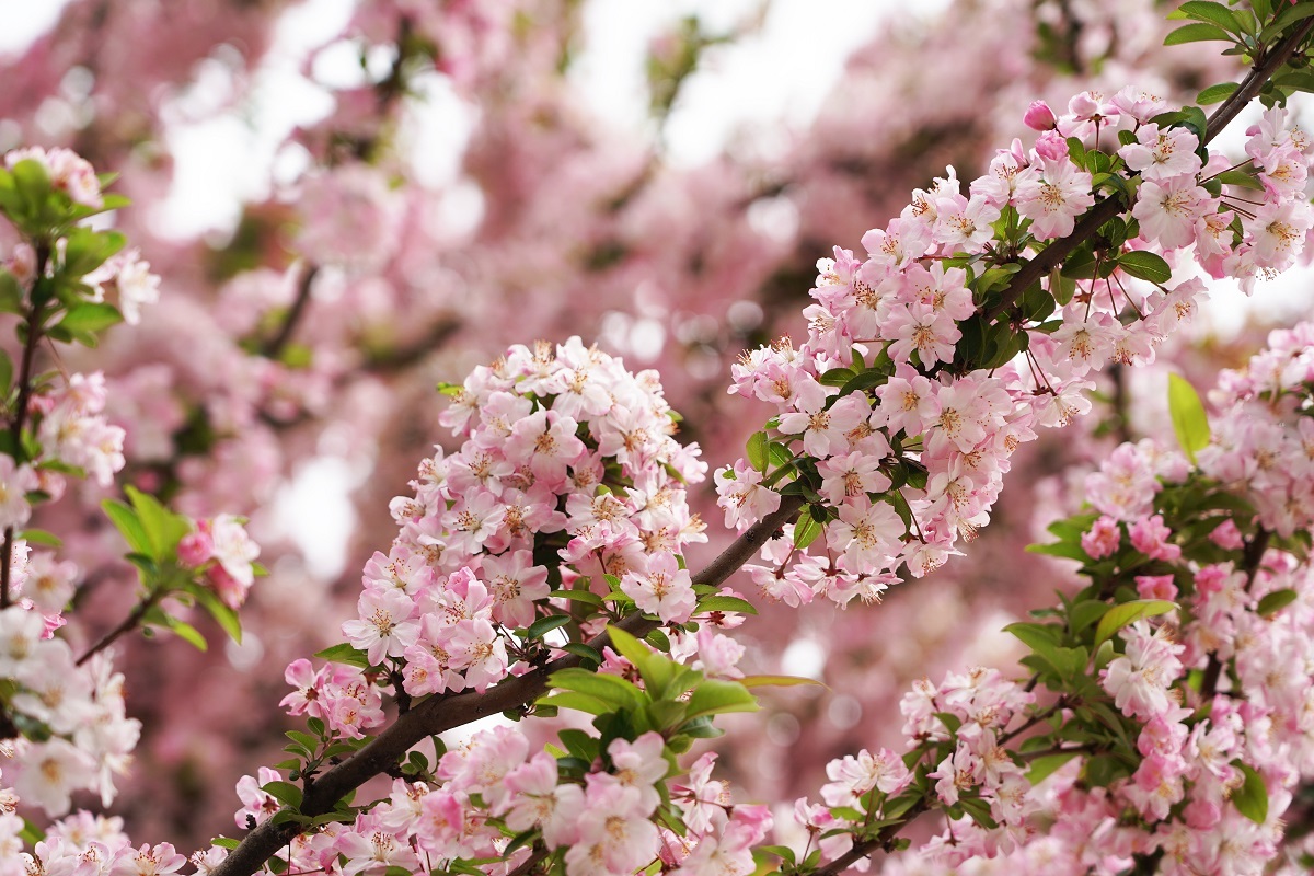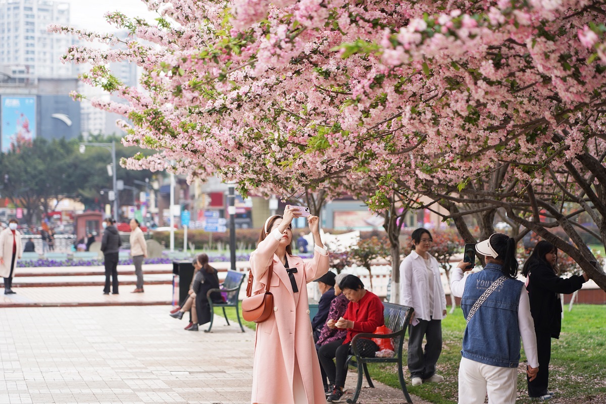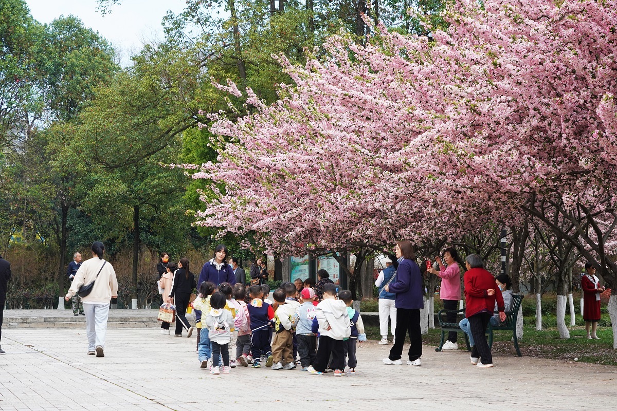 阳春三月,满园海棠竞芳菲。3月25日上午,记者走进绵阳市人民公园,发现成片垂丝海棠争相绽放,粉色的海棠花犹如美丽的花精灵,在春风和暖阳中翩翩起舞,成为城市里靓丽的风景。不少市民被眼前美景吸引住,纷纷驻足拍照打卡,感受这春日里的浪漫。