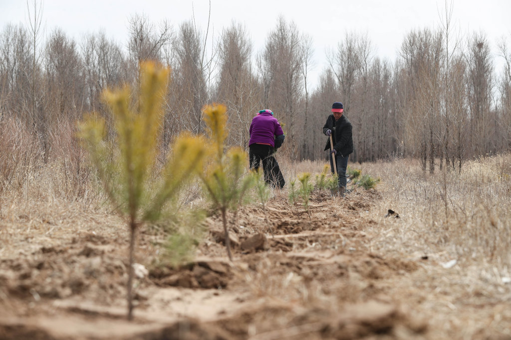 3月25日,辽宁省阜新市彰武县大德镇黄花村村民在植树。