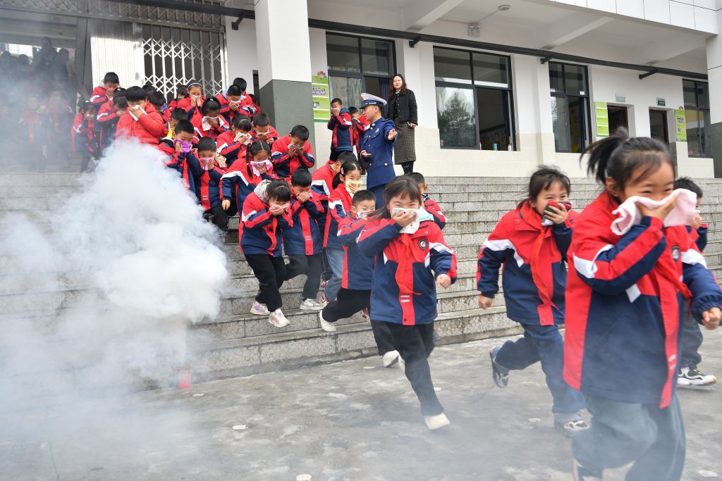 3月25日,在湖北省襄阳市保康县实验小学,学生进行消防应急逃生演练。