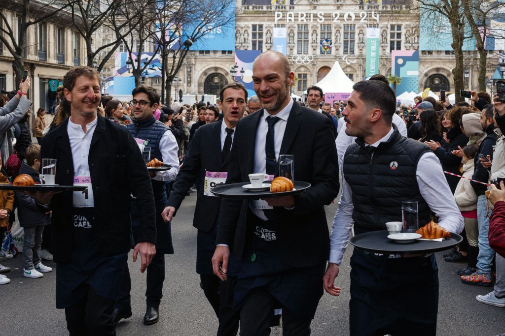 为迎接今年夏天在当地举行的奥林匹克运动会,法国首都巴黎24日恢复一项百年历史赛事:服务员赛跑。数百名穿着制服的男女服务员当天手托餐盘,餐盘内放着羊角面包、一个空咖啡杯和一杯水,从巴黎市政厅出发,沿环线跑完2公里的赛程。巴黎服务员赛跑最早始于1914年,但最近13年比赛中断。
