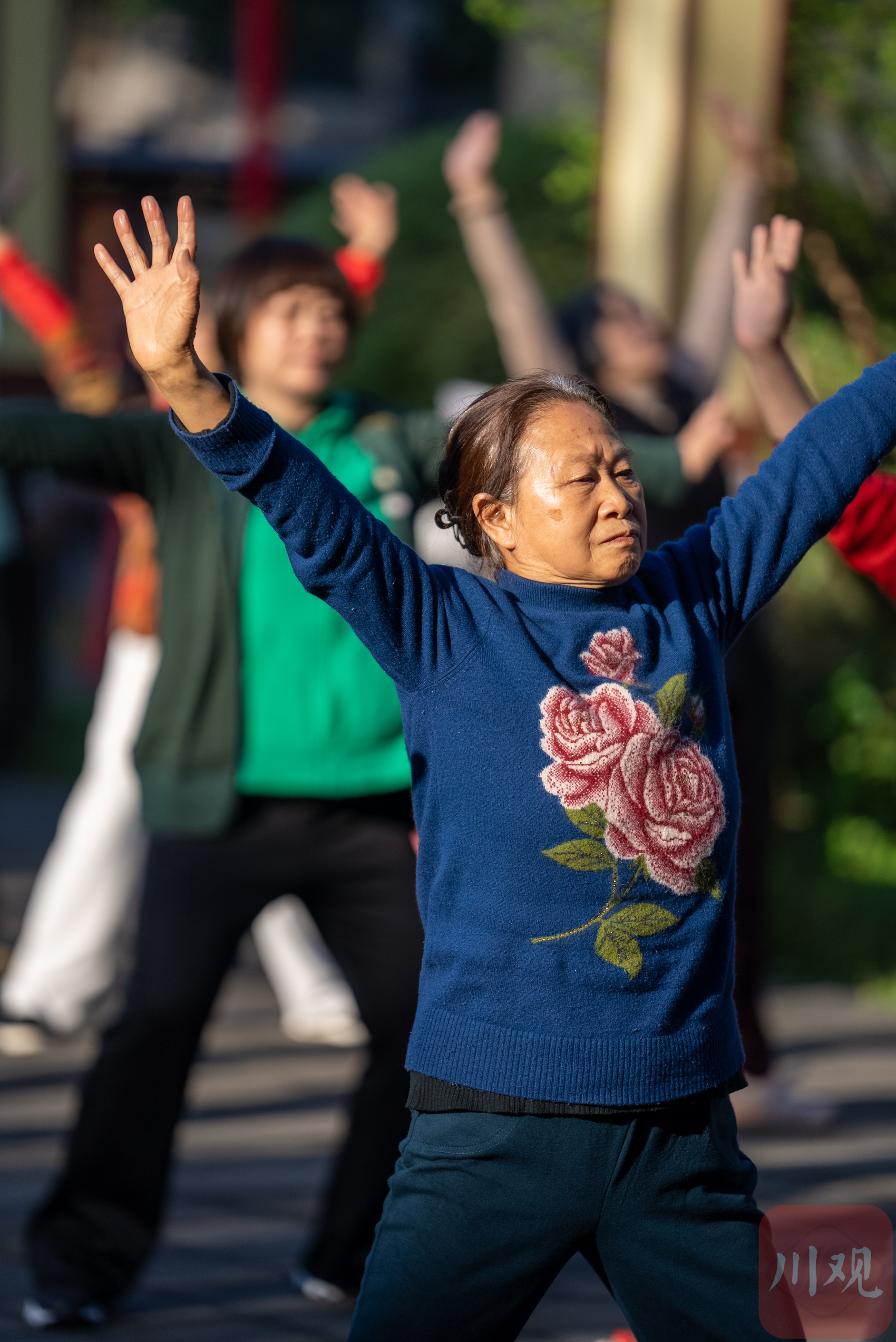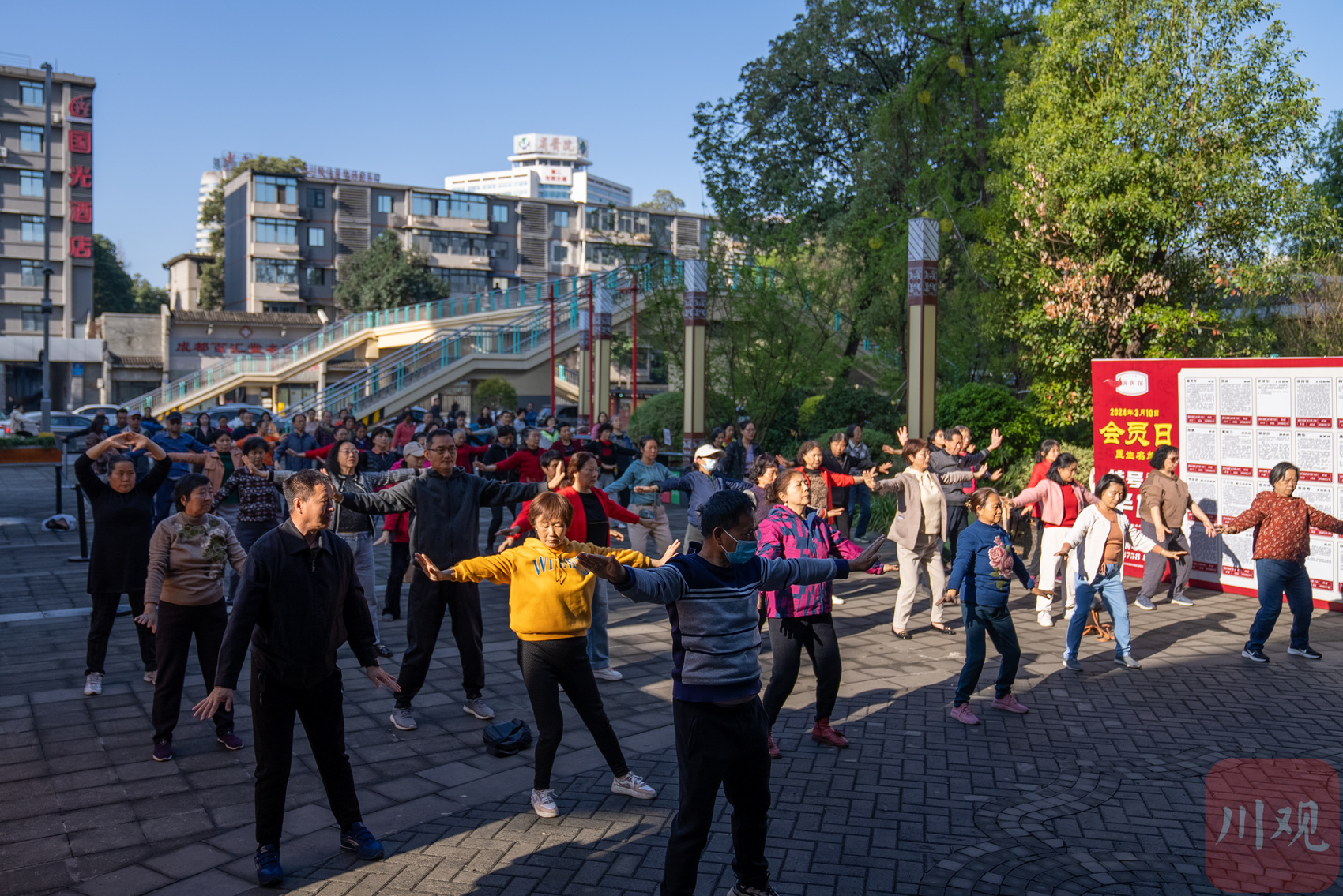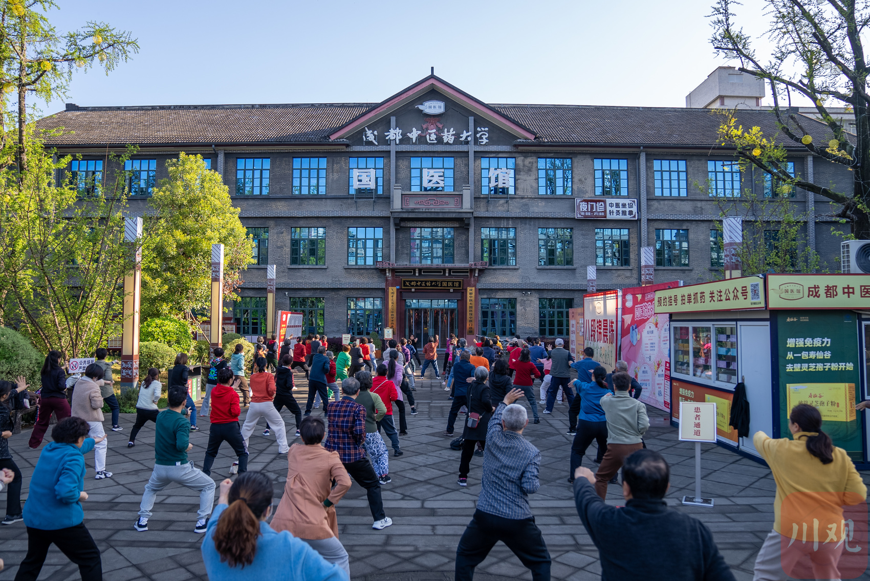 成都中医药大学国医馆门前,市民正进行八段锦晨练。