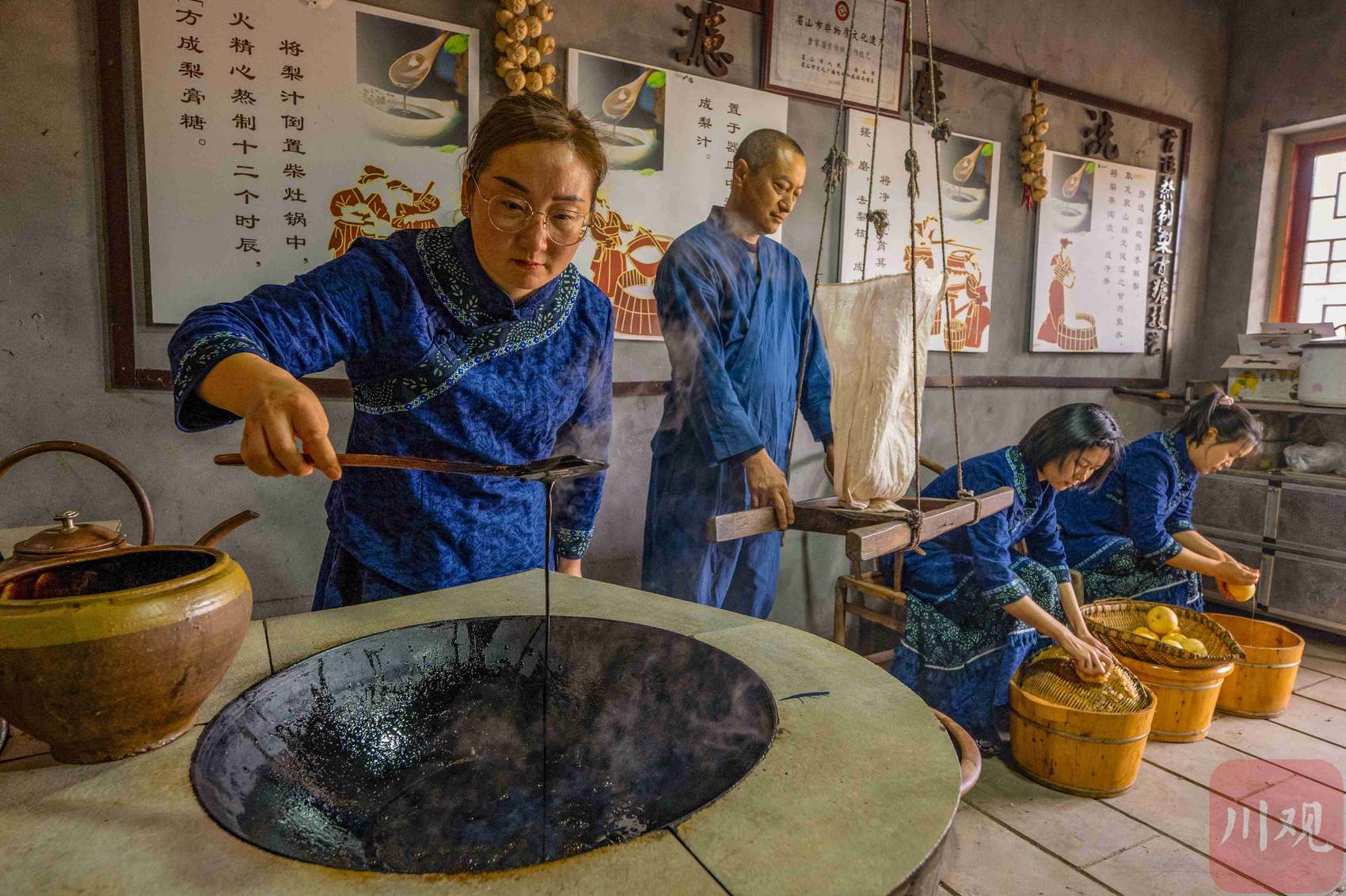 3月20日,仁寿县曹家镇梨树社区梨膏制作非遗传承人宋芬(左)在制作传承百年的梨膏。
