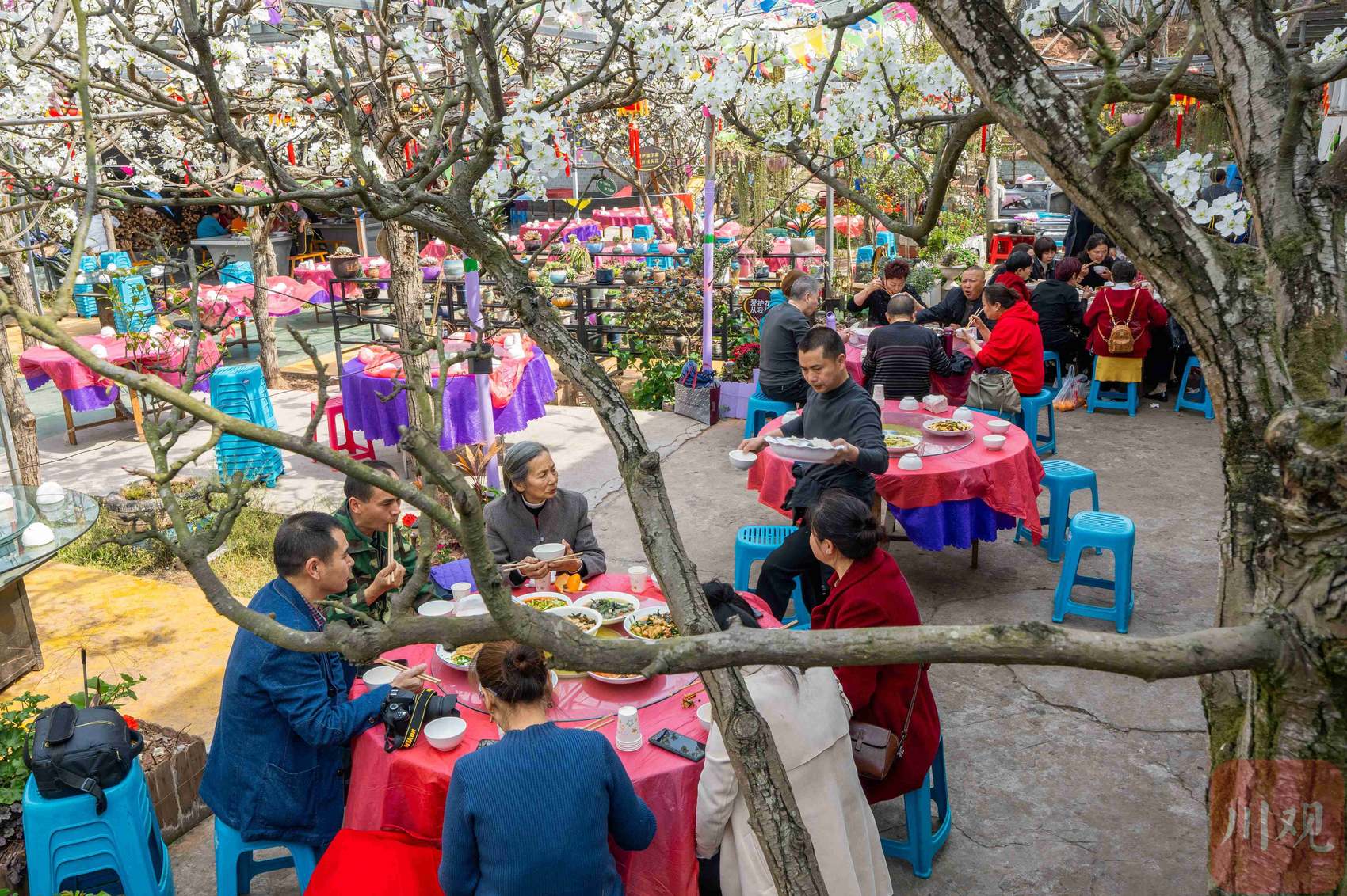 3月20日,游客在仁寿县曹家镇盛开的梨花下感受乡村风貌,品尝当地美食。