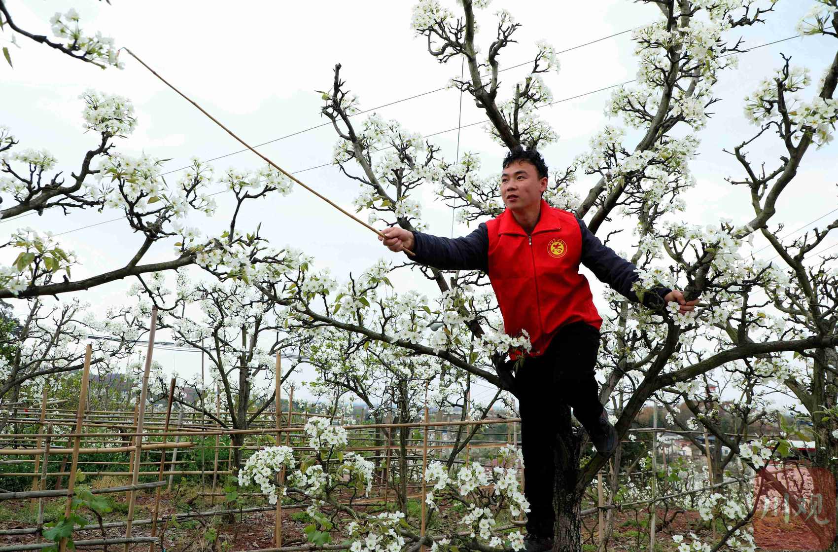 3月20日,党员志愿者在仁寿县曹家镇梨园村帮助果农进行梨花人工授粉。