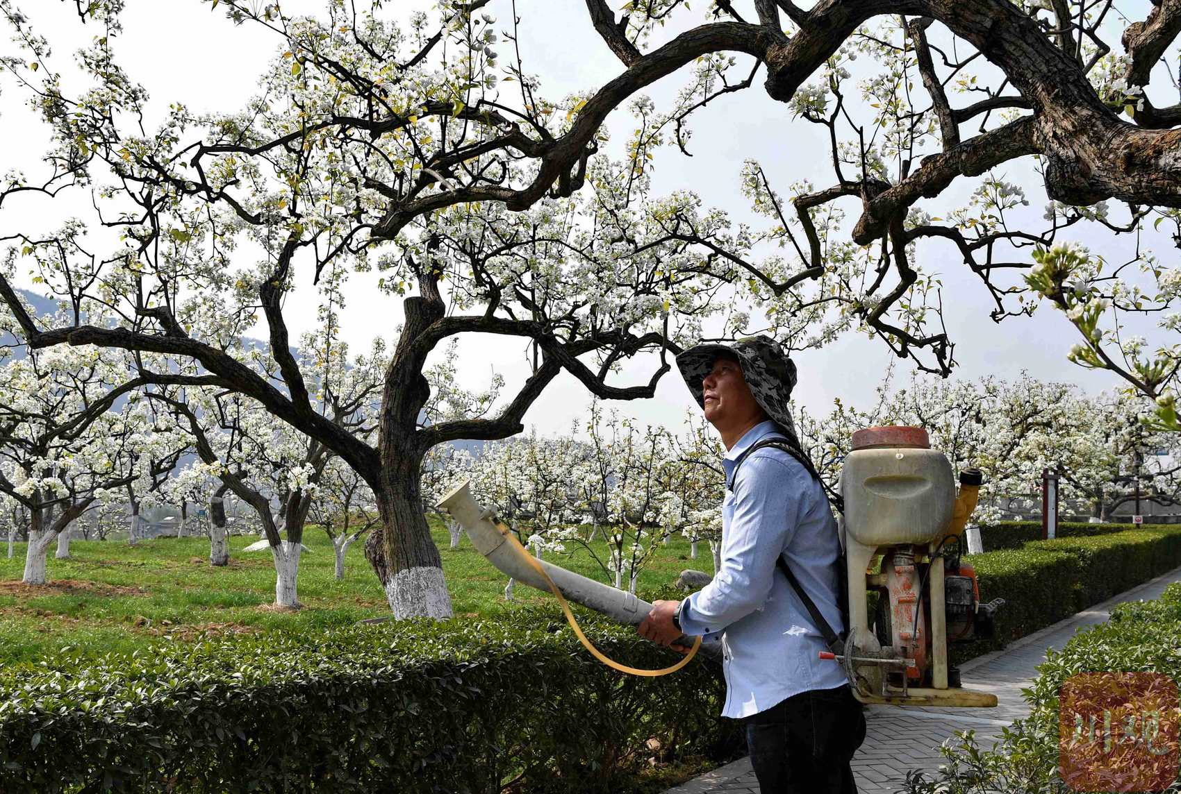 3月23日,苍溪县苍溪梨博园梨树管理人员正在对老梨树进行人工喷雾授粉。