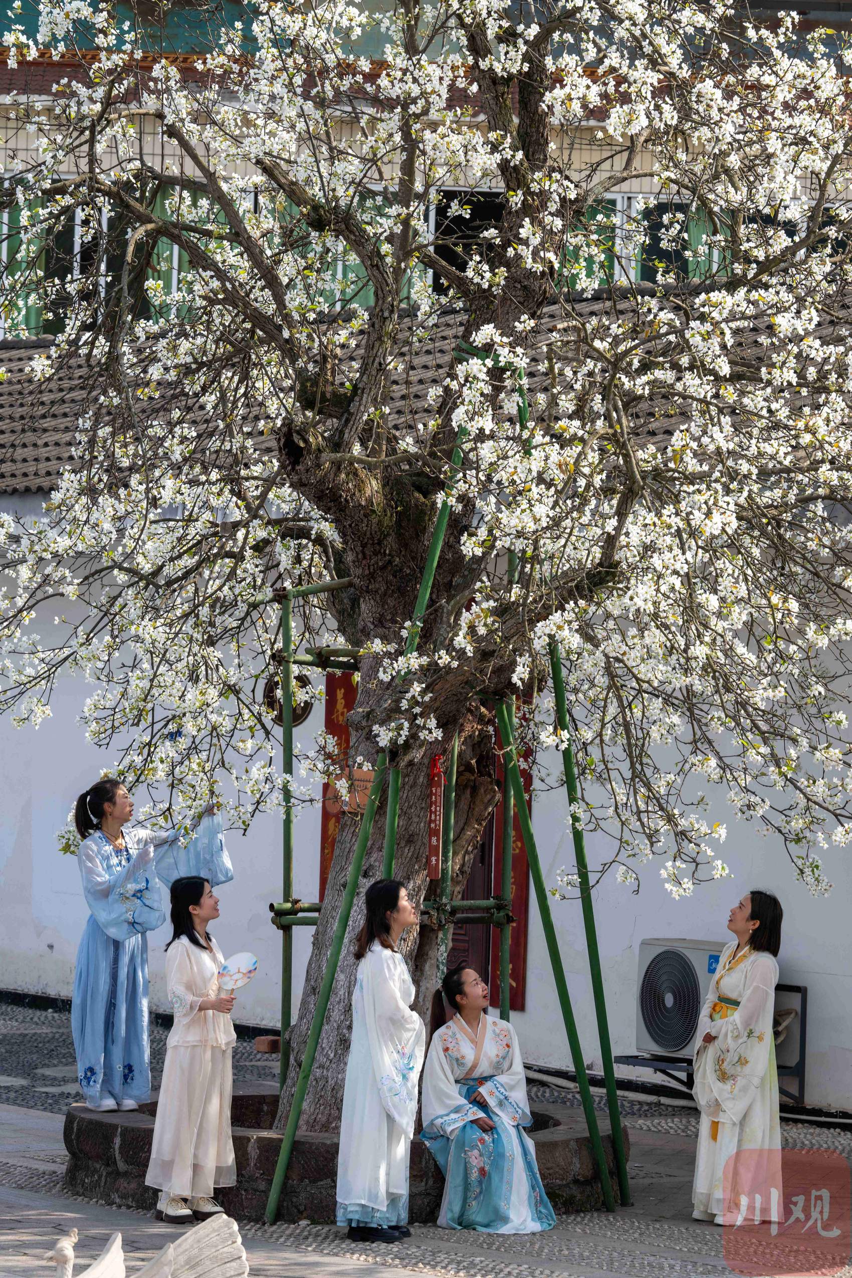3月21日,身着汉服的赏花者在仁寿县曹家镇约400岁的梨树王下赏花、拍照。