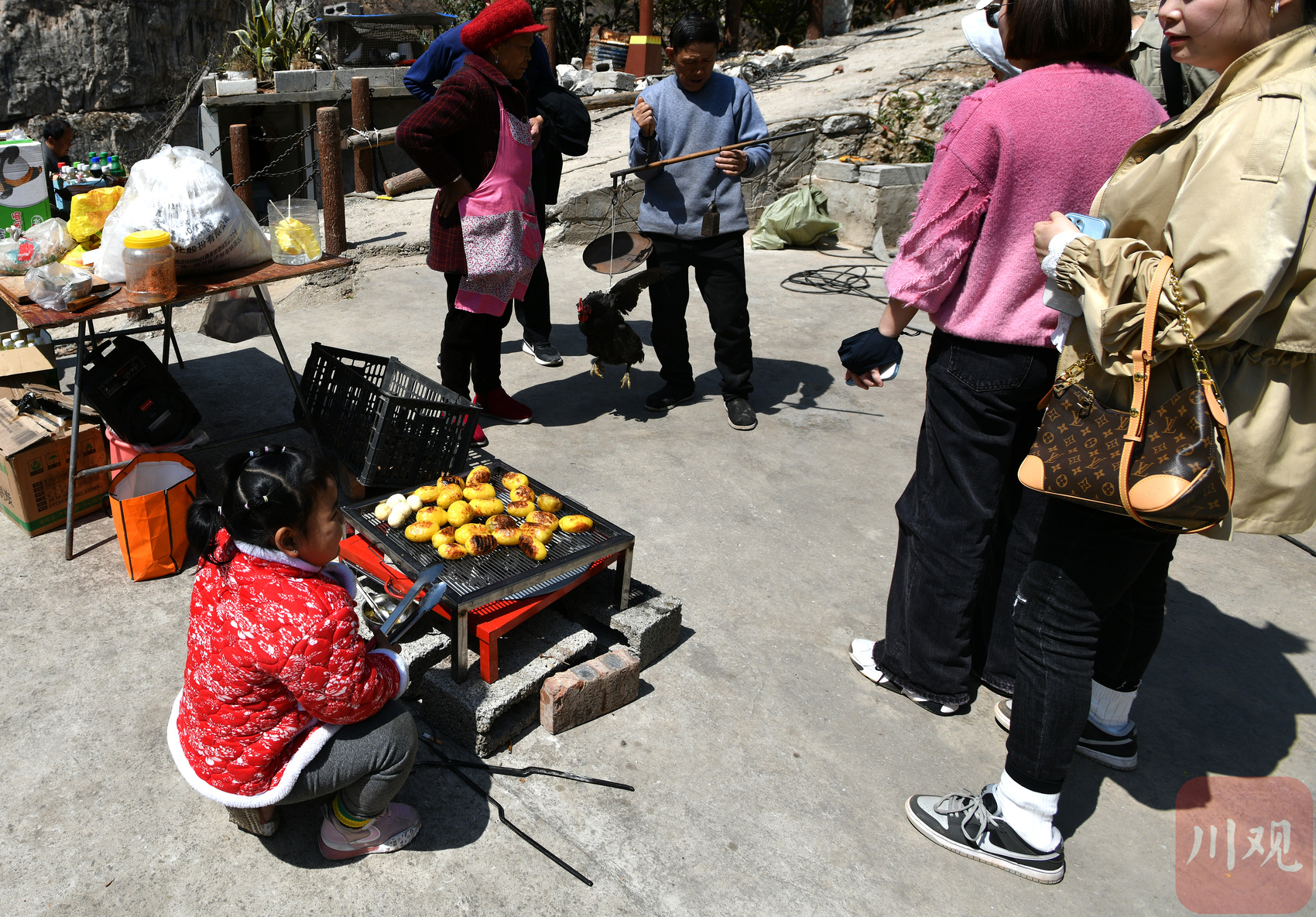 10时,第一波游客还没到达,庆术莲便安排老伴李其学“再多烧两壶开水”,这是专门给过路游客准备的。3月12日,一位年轻女游客扭了脚,庆术莲邀请她来坐坐并送了一杯热水,后者兴奋地喊着“感谢老板宠粉”。隔天,有五位游客专门跑来购买烤肉和饮料,说看到了那位女游客发的抖音和小红书。