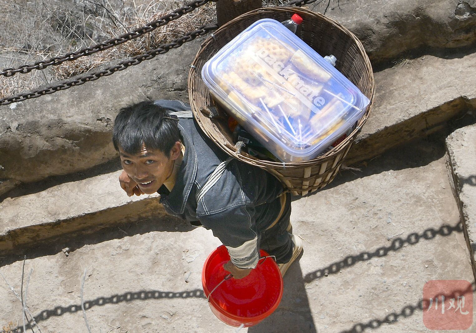 3月21日,马文进背着竹筐在售卖饮料和水果。华小峰 摄