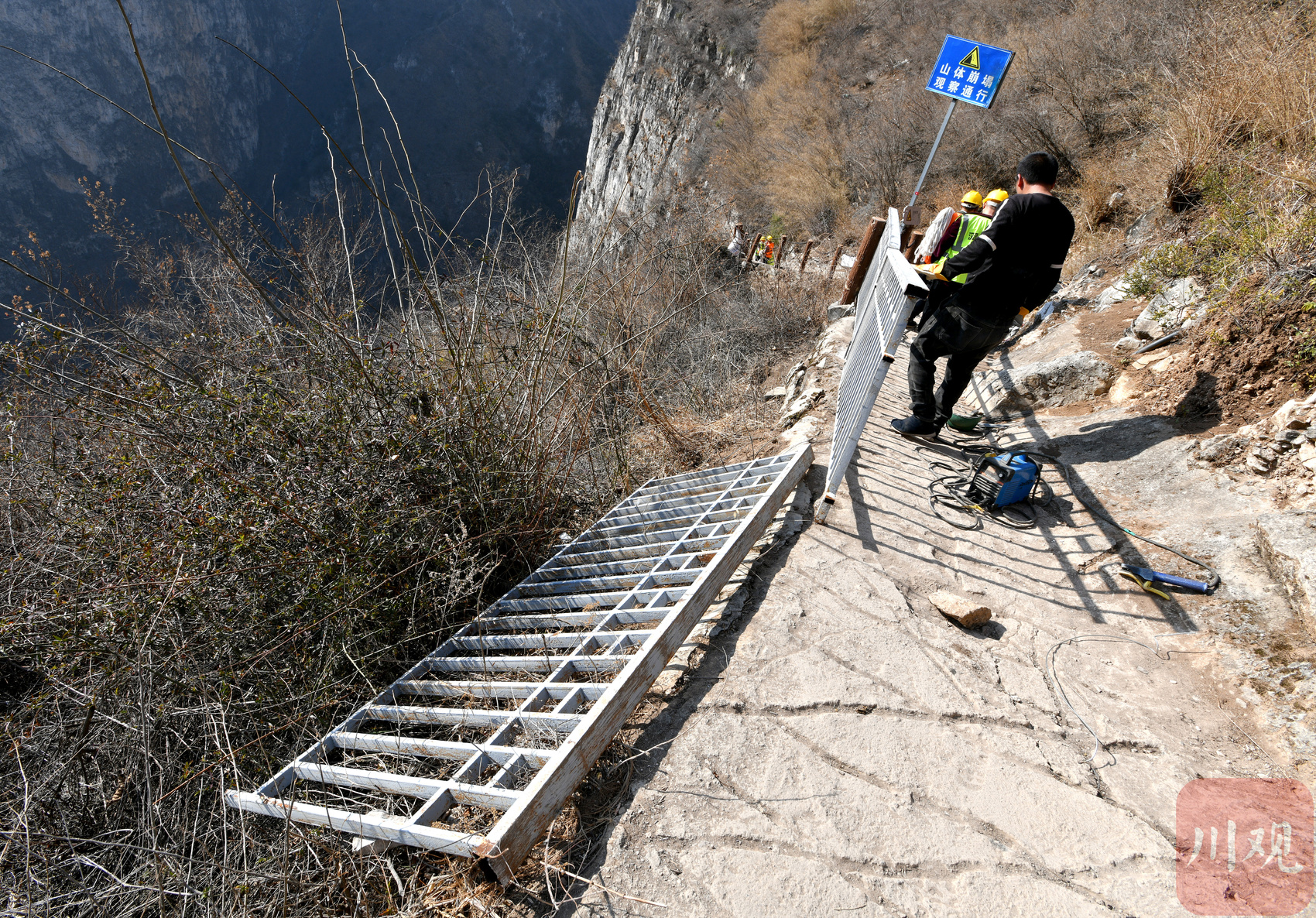 3月22日,工作人员正在给骡马道加固安全护栏。自从爆红以来,部分危险路段安装护栏已经迫在眉睫。华小峰 摄
