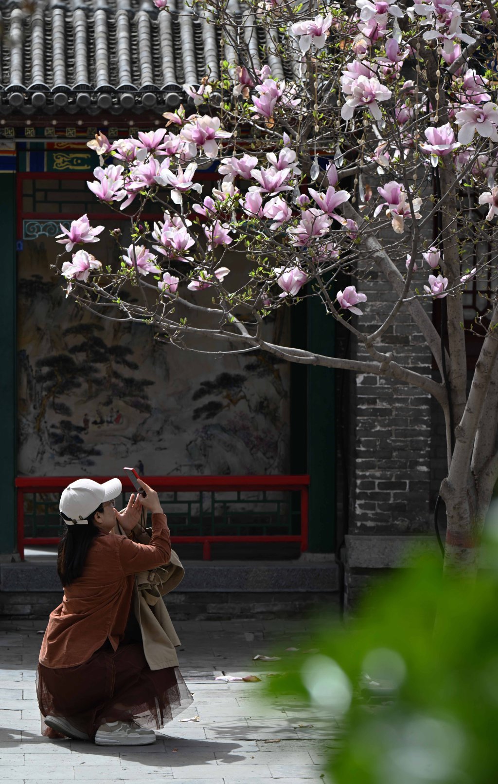 3月28日,游客在河北省石家庄市正定古城赏花拍摄。
