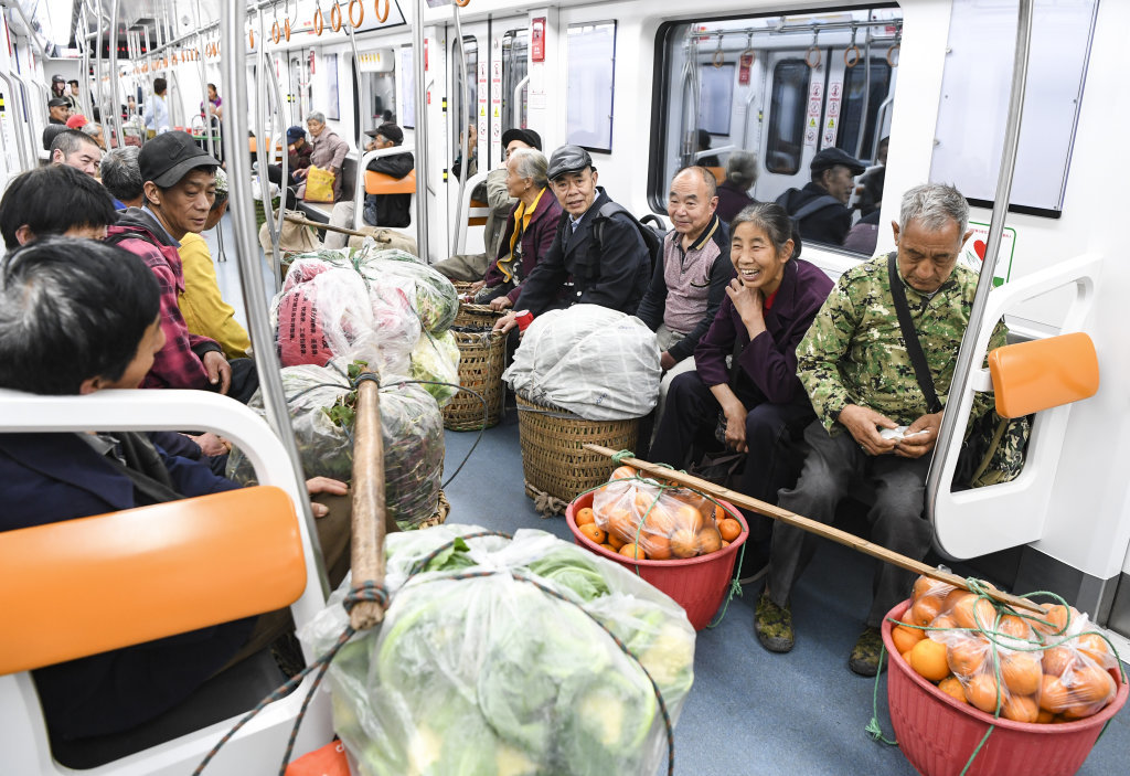 3月27日清晨,菜农乘坐重庆轨道交通4号线,准备前往城区的菜市场售卖农产品。