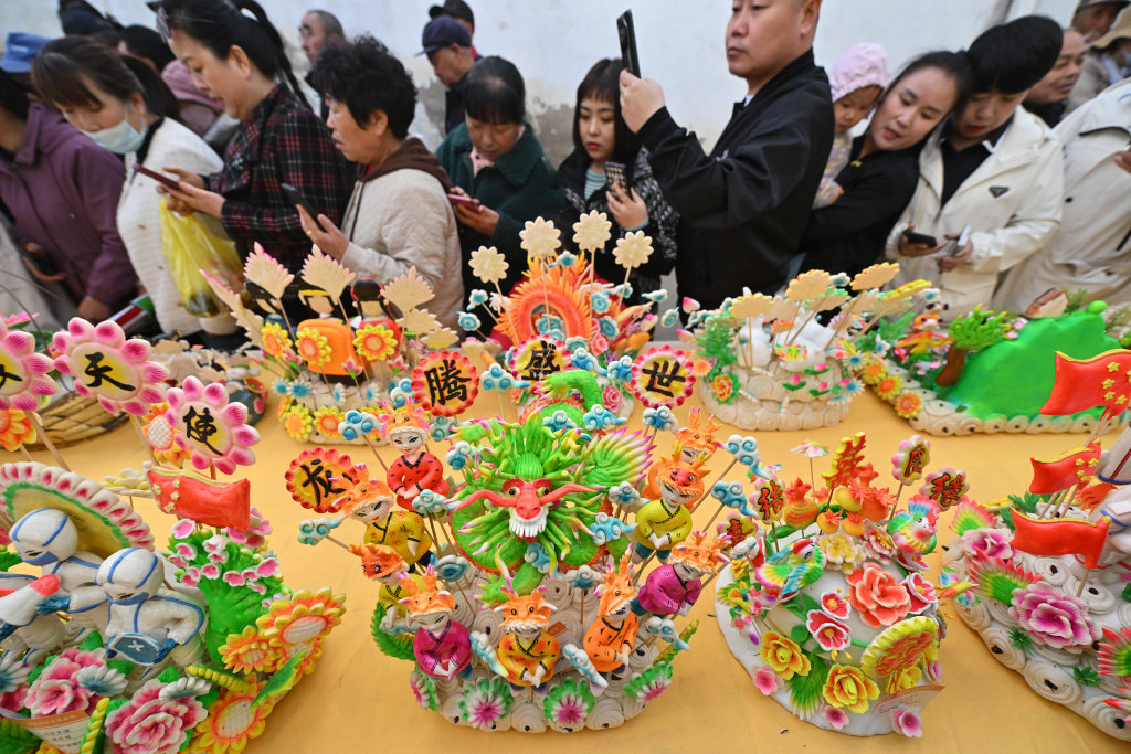 3月28日,在山西省岚县岚城镇,人们欣赏面塑作品。