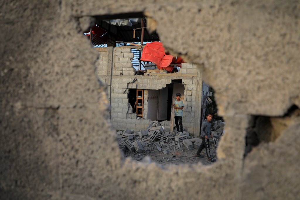 3月27日,在加沙地带南部城市拉法,儿童路过被以军空袭的建筑。
