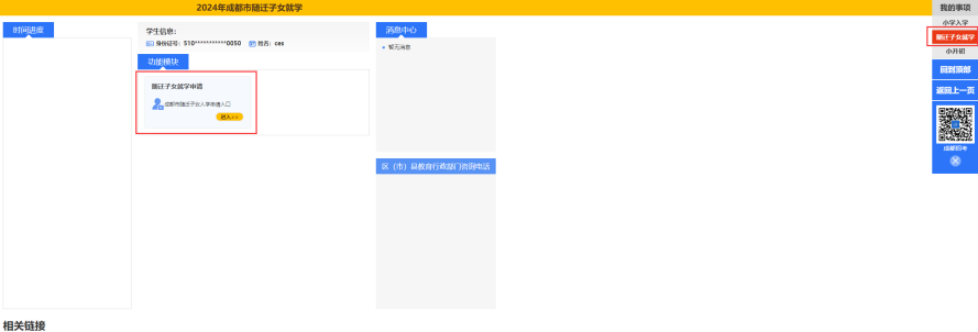 登录“成都招考”后,点击“我的事项”中的“随迁子女就学”或“小升初”或“小学入学”,点击功能模块中的“随迁子女就学申请”。