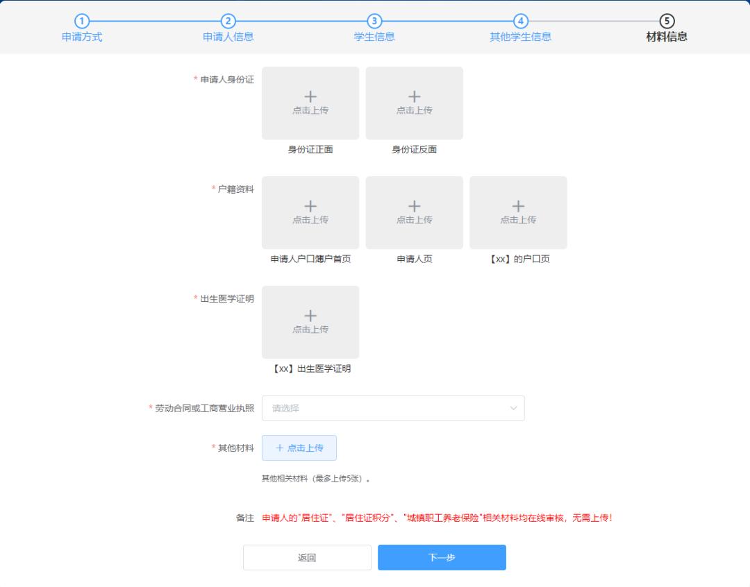 申请信息需填写申请人居住信息、申请人信息、学生基础信息、材料信息。