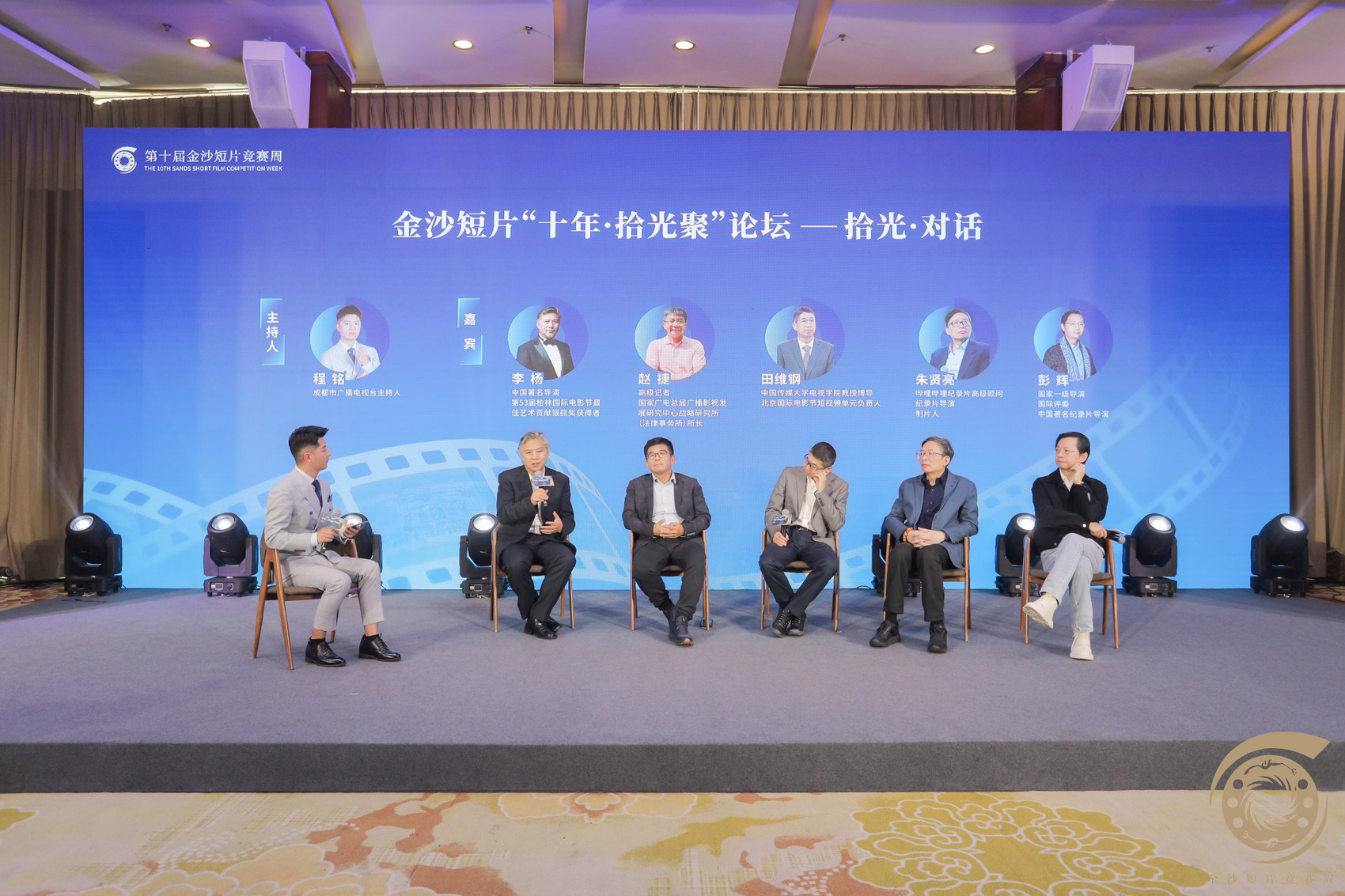 发布仪式现场,结缘金沙短片竞赛周多年的罗依体、刘卡达、王光利导演分别做了主题分享,回顾了金沙短片竞赛周的十年历程,在题材选取、创作内核等方面分享了各自的经验和心得,并展望了短片行业的未来发展趋势。李杨等五位行业嘉宾分别就短片在影视行业中的发展趋势、高校短片制作的挑战与机遇等话题进行了深入分享和对话。