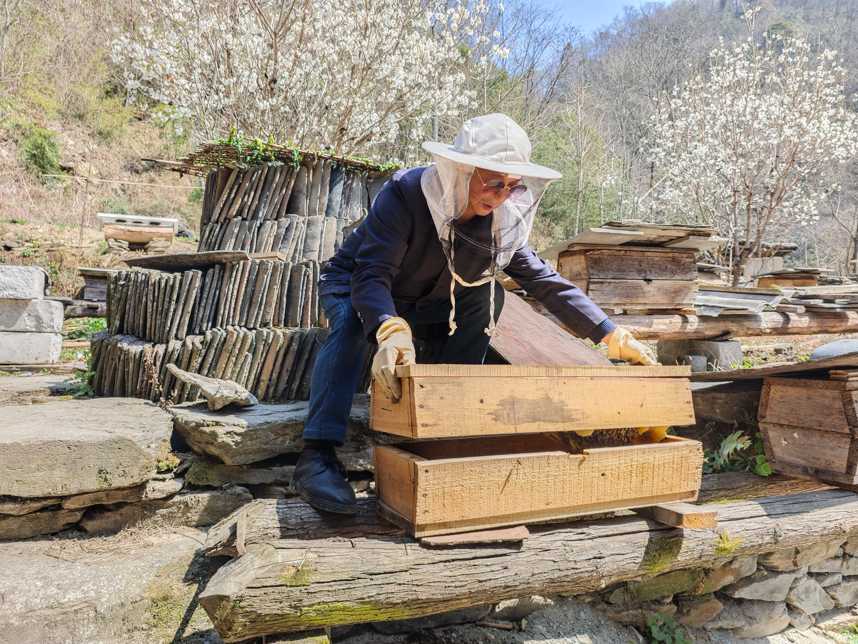 群山环抱,白云悠悠,目之所及皆是一片苍翠。正是在这样的环境里,山坡上、池塘边、丛林下错落有致的摆放着一栋栋“小房子”,十分惹眼。走近些,能看到不时有蜜蜂进进出出,向山间的蜜源植物飞去……3月27日,在广元市青川县姚渡镇柳田村,71岁的王正祥像往常一样照料着这些黑中带黄的“小精灵”。