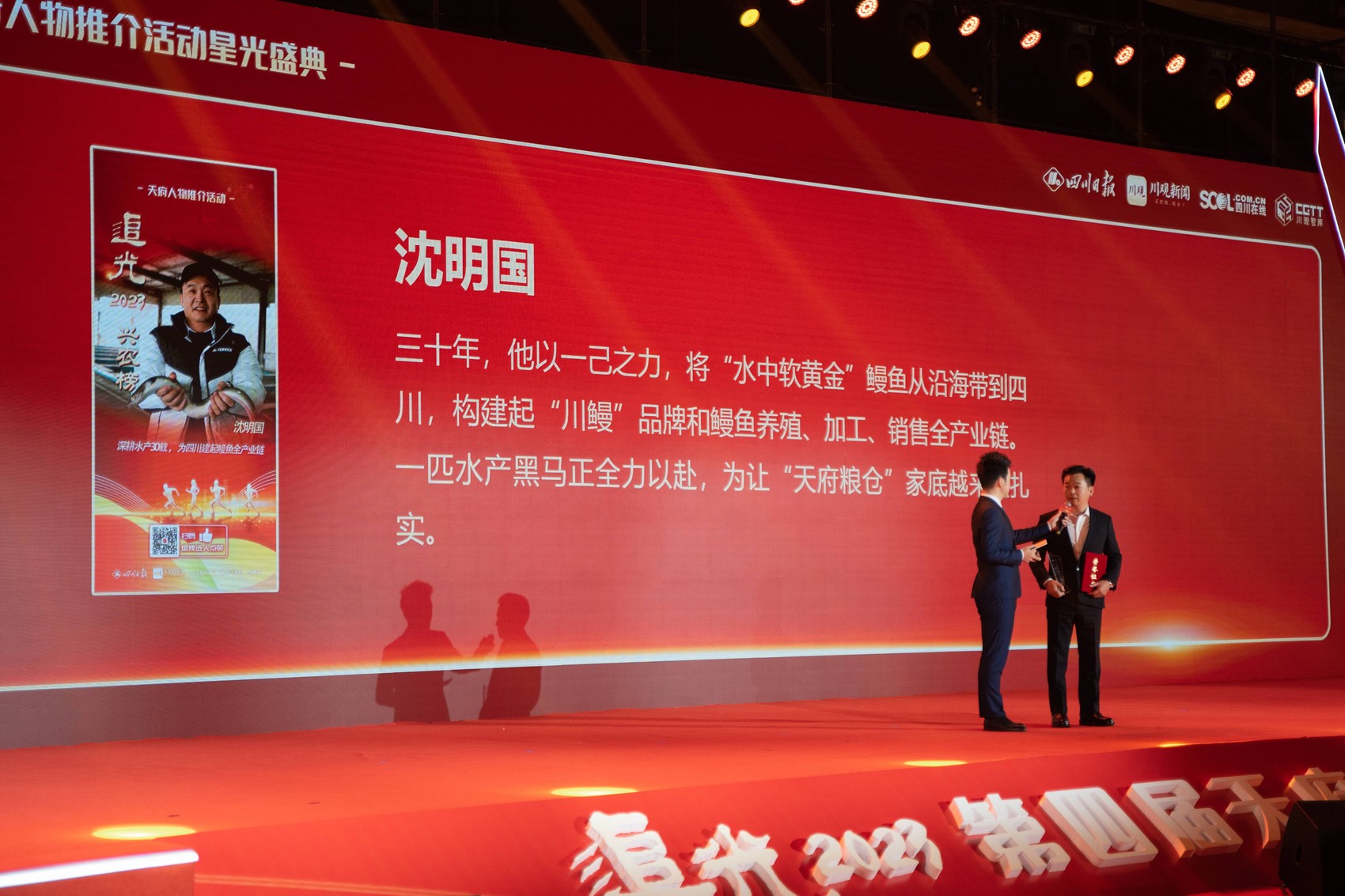 “三十年,他以一己之力,将‘水中软黄金’鳗鱼从沿海带到四川,构建起‘川鳗’品牌和鳗鱼养殖、加工、销售全产业链。一匹水产黑马正全力以赴,为让‘天府粮仓’家底越来越扎实。”一段颁奖词,让众人认识了这位凭一己之力为四川建起一条鳗鱼养殖、加工销售全产业链的获选人——沈明国。