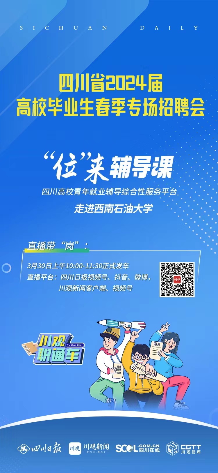 30日上午10点,由四川日报社联合众多高校共同推出的高校青年就业辅导课程“‘位’来辅导课”将走入西南石油大学,在本次招聘会现场进行直播,邀请现场知名企业HR、西南石油大学老师、高校青年,为大家带来招聘岗位信息、就业咨询与辅导。
