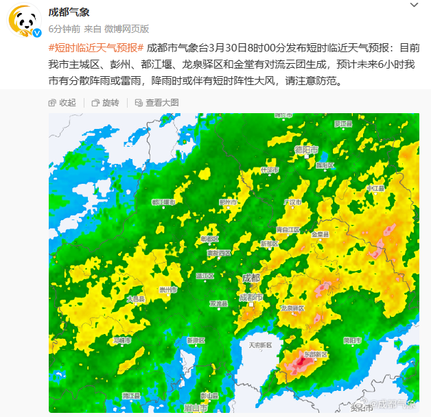 成都市气象台3月30日8时发布短时临近天气预报:目前成都市主城区、彭州、都江堰、龙泉驿区和金堂有对流云团生成,预计未来6小时成都市有分散阵雨或雷雨,降雨时或伴有短时阵性大风,请注意防范。