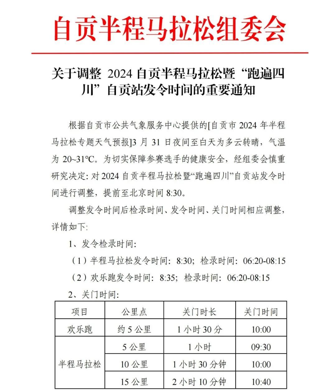根据自贡市公共气象服务中心提供的[自贡市2024年半程马拉松专题天气预报]13月31日夜间至白天为多云转晴,气温为 20~31°℃。为切实保障参赛选手的健康安全,经组委会慎重研究决定:对2024自贡半程马拉松暨“跑遍四川”自贡站发令时间进行调整,提前至北京时间8:30。