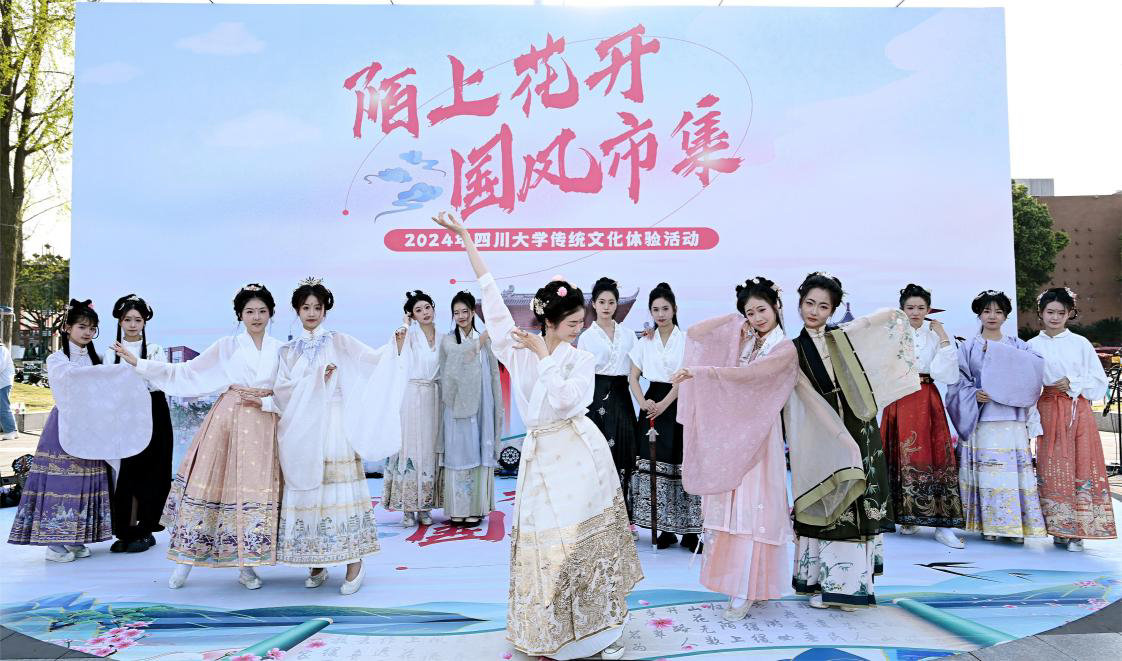 此外,同学们还带来了精彩绝伦的国风表演,汉服走秀、川剧演出等节目让国风、国韵、国潮走近学生身边、走进学生心里,让学生在“双向奔赴”中感受中华优秀传统文化之美。