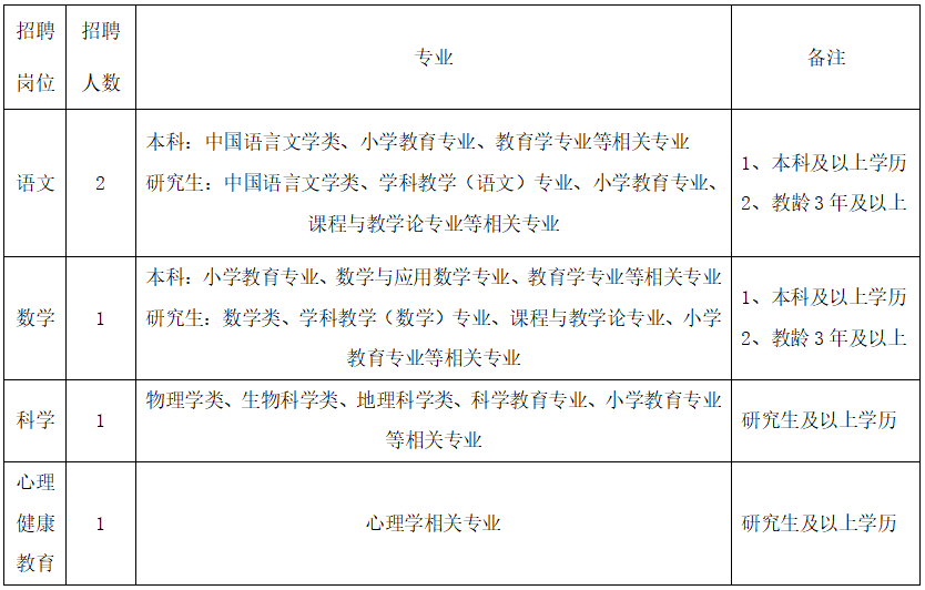 本次面向社会公开招聘小学教师,具体岗位及要求如下:语文教师2人;数学教师1人;科学教师1人;心理健康教育教师1人。