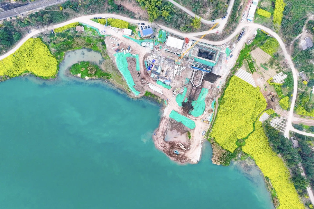 进入3月施工黄金期。威远经开区页岩气综合利用化工园区、供水管网及配套工程取水泵站项目正处于加速推进之中。工人们配合工程车进行取水,头部施工和机电设备安装,为后续正式通水打下坚实基础。