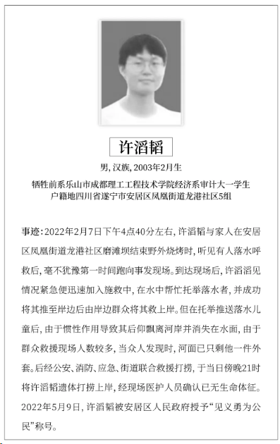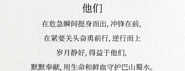 天地英雄气,千秋尚凛然。他们是四川人民的好儿女,他们是巴蜀大地的精神脊梁,他们在危难时刻,勇往直前、舍生取义,用生命写下对生命的尊重,用牺牲和奉献诠释人生价值,为全社会树立起一座座令人敬仰的道德丰碑。他们是耀眼的星光,照亮了漫漫长夜!是灼人的滚烫,温暖了整个世界!让我们赞叹并铭记,这些属于我们的平凡英雄!