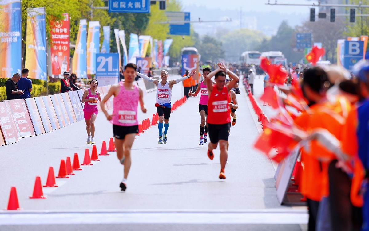 男子组半程马拉松赛场上,中国选手向新鹏以01:08:25的成绩夺得第一名,中国选手安国军、肯尼亚选手GIDEON EMMANUEL MUOKI 分别获得二、三名。