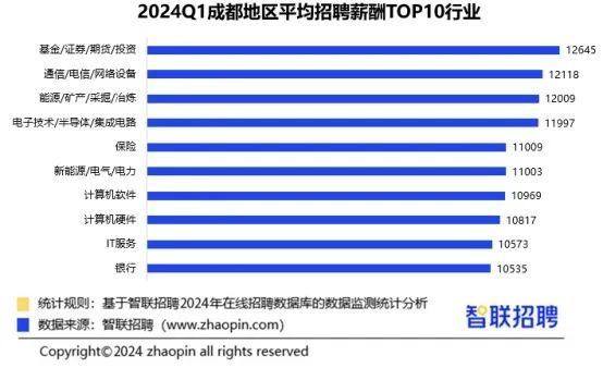 行业方面,一季度成都地区基金/证券/期货/投资(12645元)、保险(11009元)、银行(10535元)等金融行业平均招聘薪资持续领先。电子技术/半导体/集成电路、计算机软件、IT服务等IT/互联网行业,以及能源/矿产/采掘/冶炼、新能源/电气/电力等行业排名位列前十,平均招聘月薪在1.1万—1.25万。
