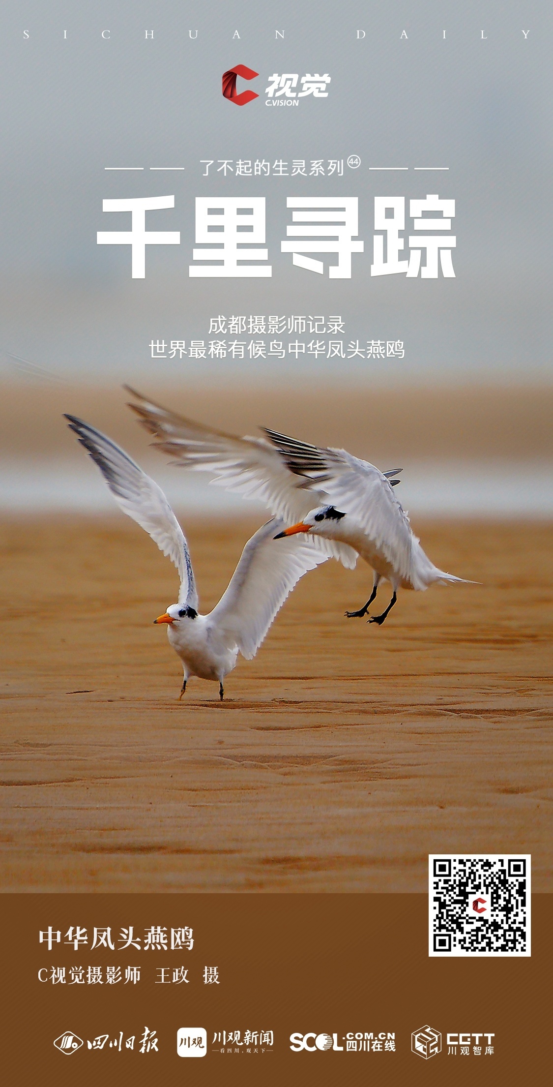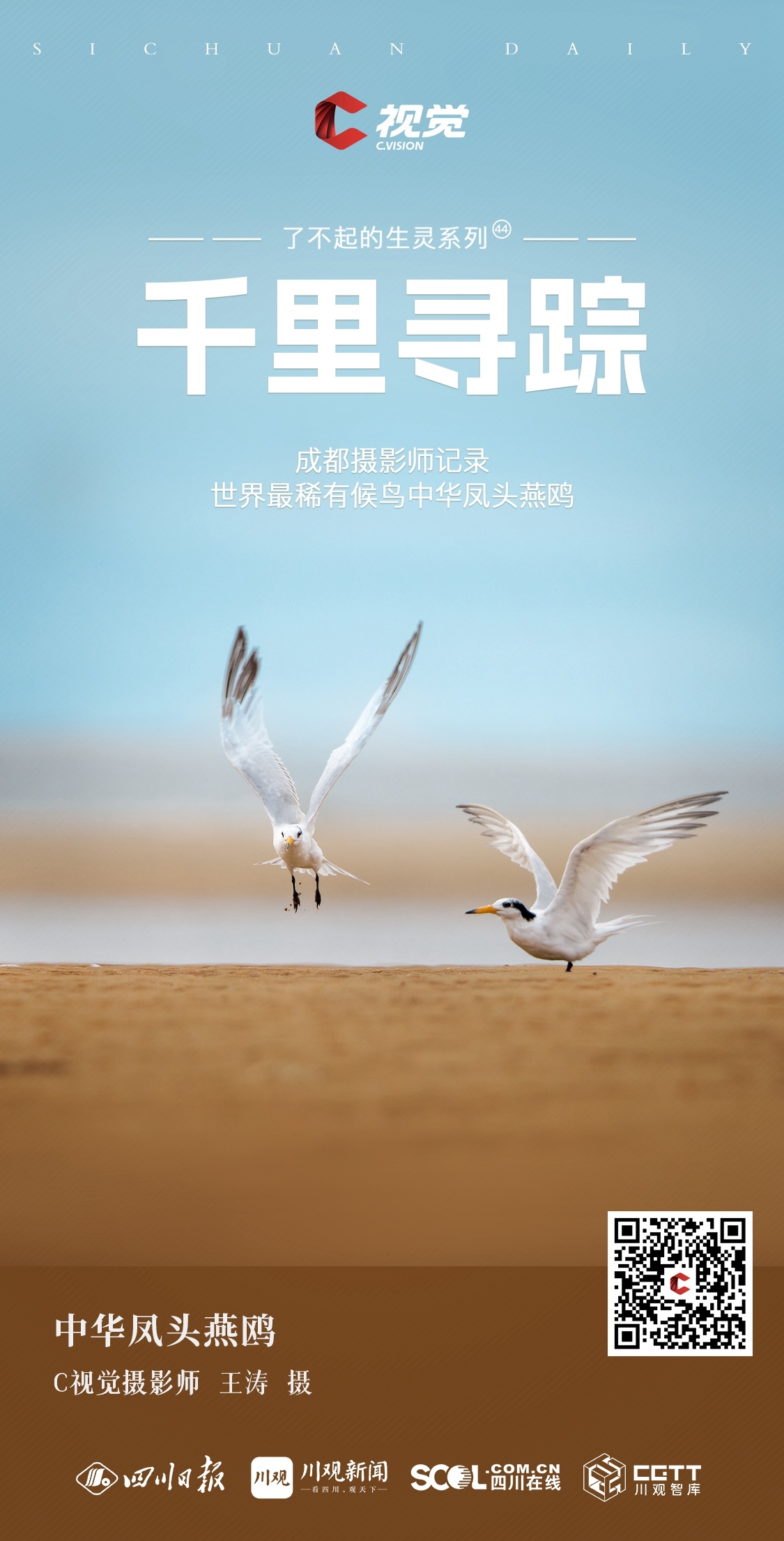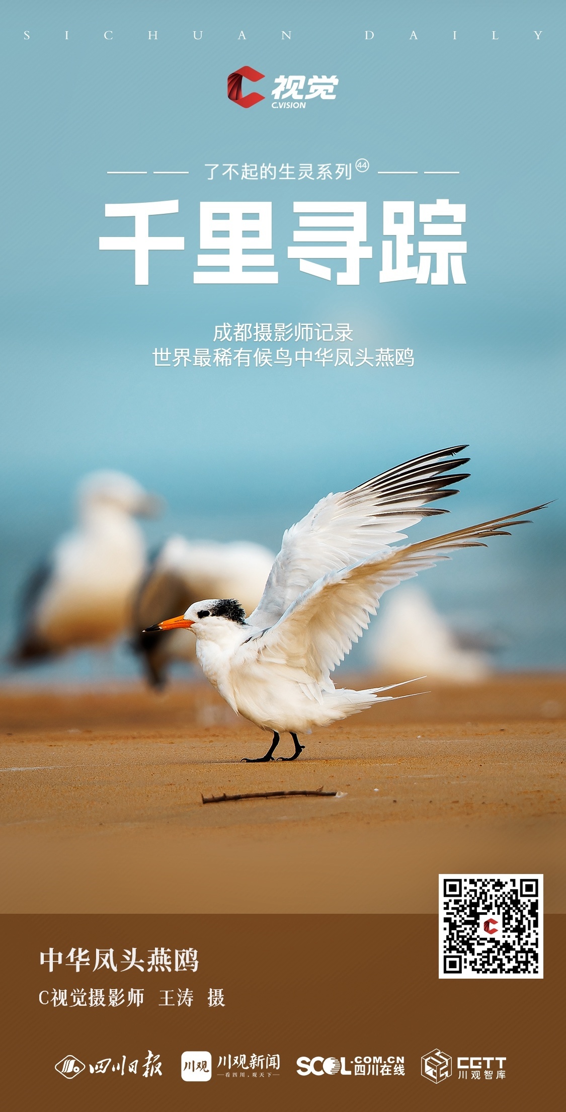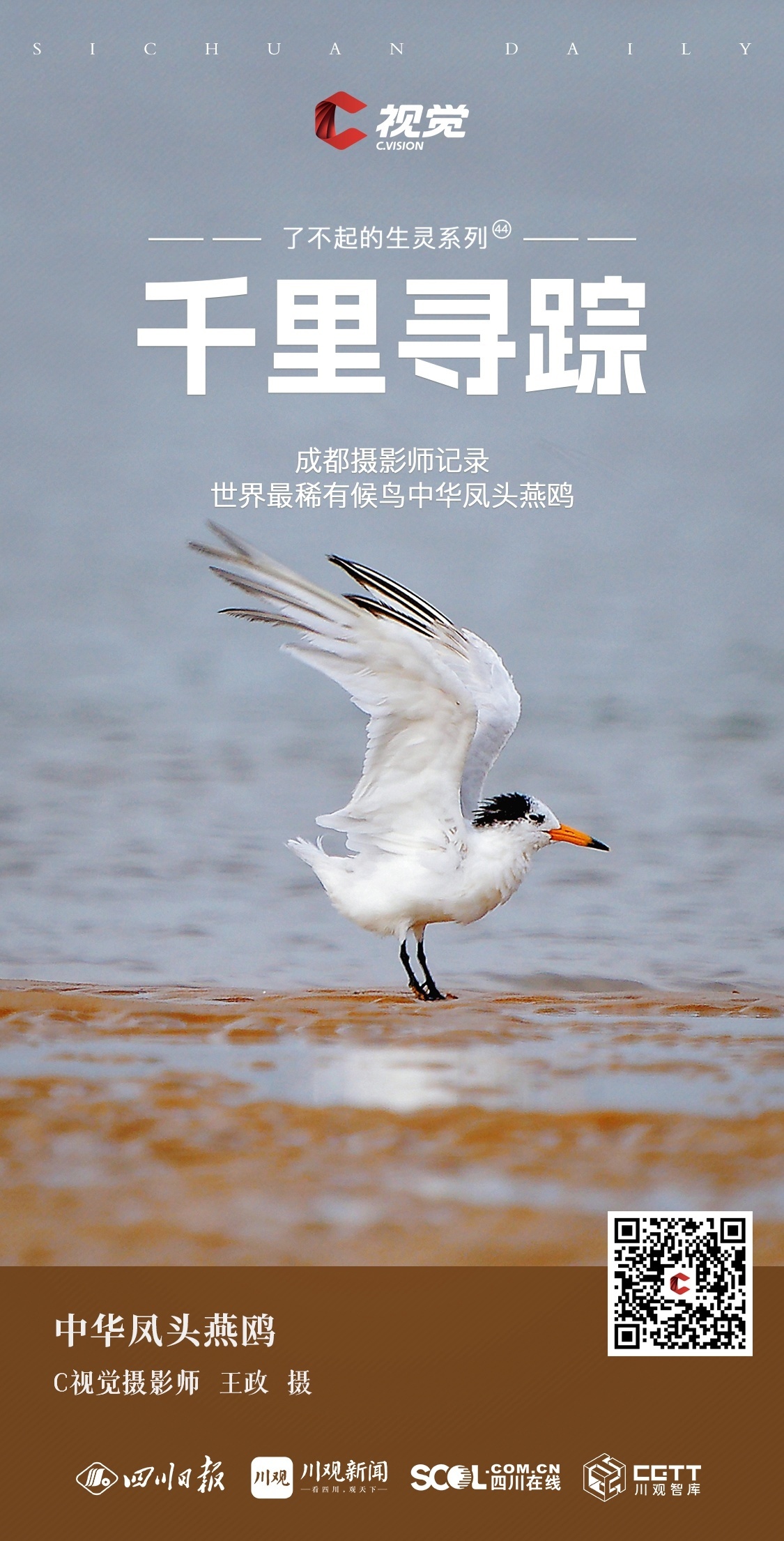 中华凤头燕鸥是世界自然保护联盟(IUCN)和国际鸟盟将认定的极度濒危品种,因其数量稀少、体态优美,又被称之为“神话之鸟”。本期“了不起的生灵”栏目邀请到成都摄影师王政和王涛来分享他们记录的世界最稀有候鸟之一:中华凤头燕鸥。