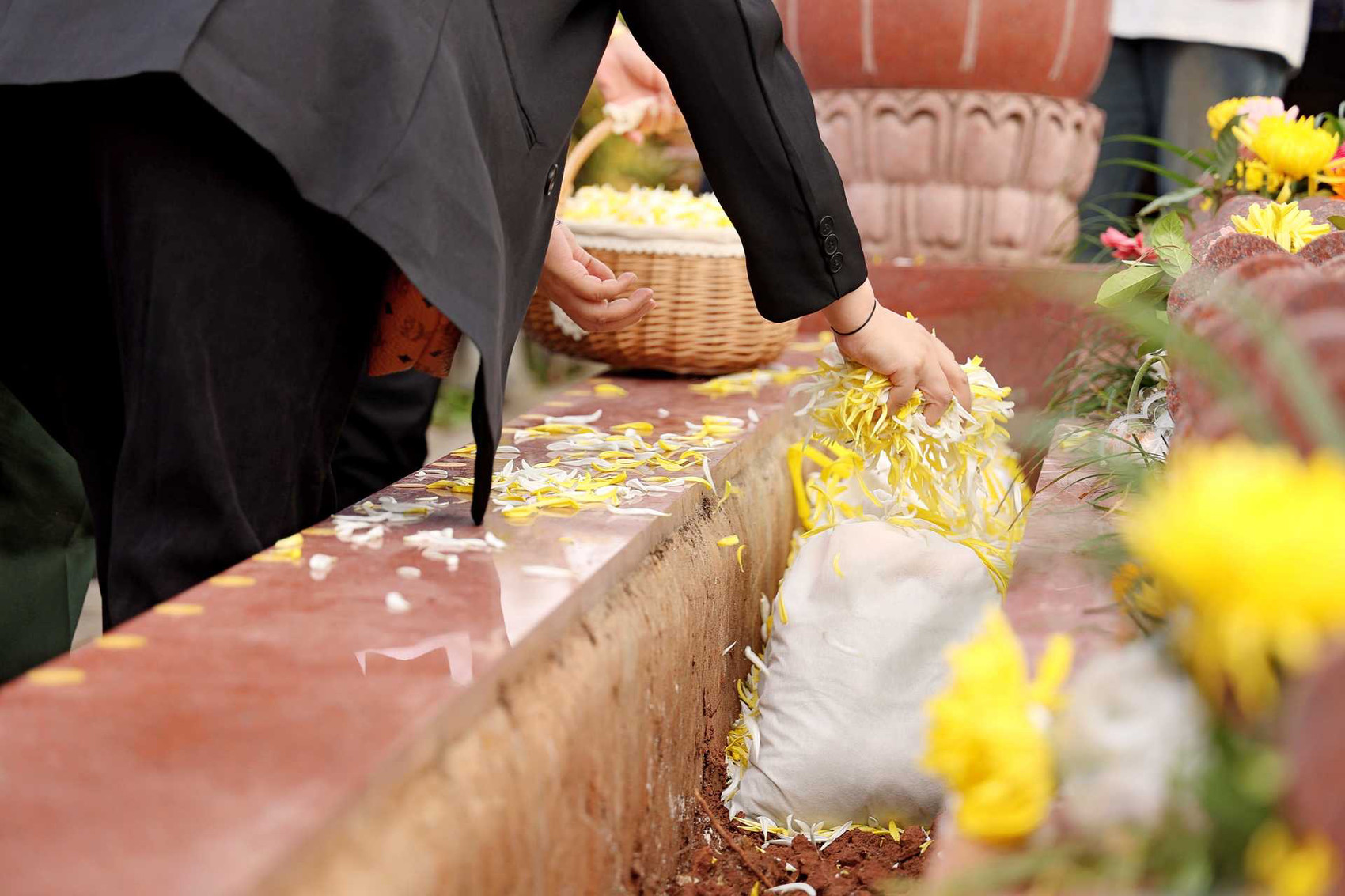 生态葬集体安葬仪式现场,礼仪人员穿着崭新礼服,手捧着逝者的骨灰袋,步伐一致缓缓步入磨盘山公墓生华园花葬区。现场来宾肃立,神情庄重,眼神缓缓注视前进方向,行注目礼,表达对逝者的深切哀悼,望逝者安息、一路走好。