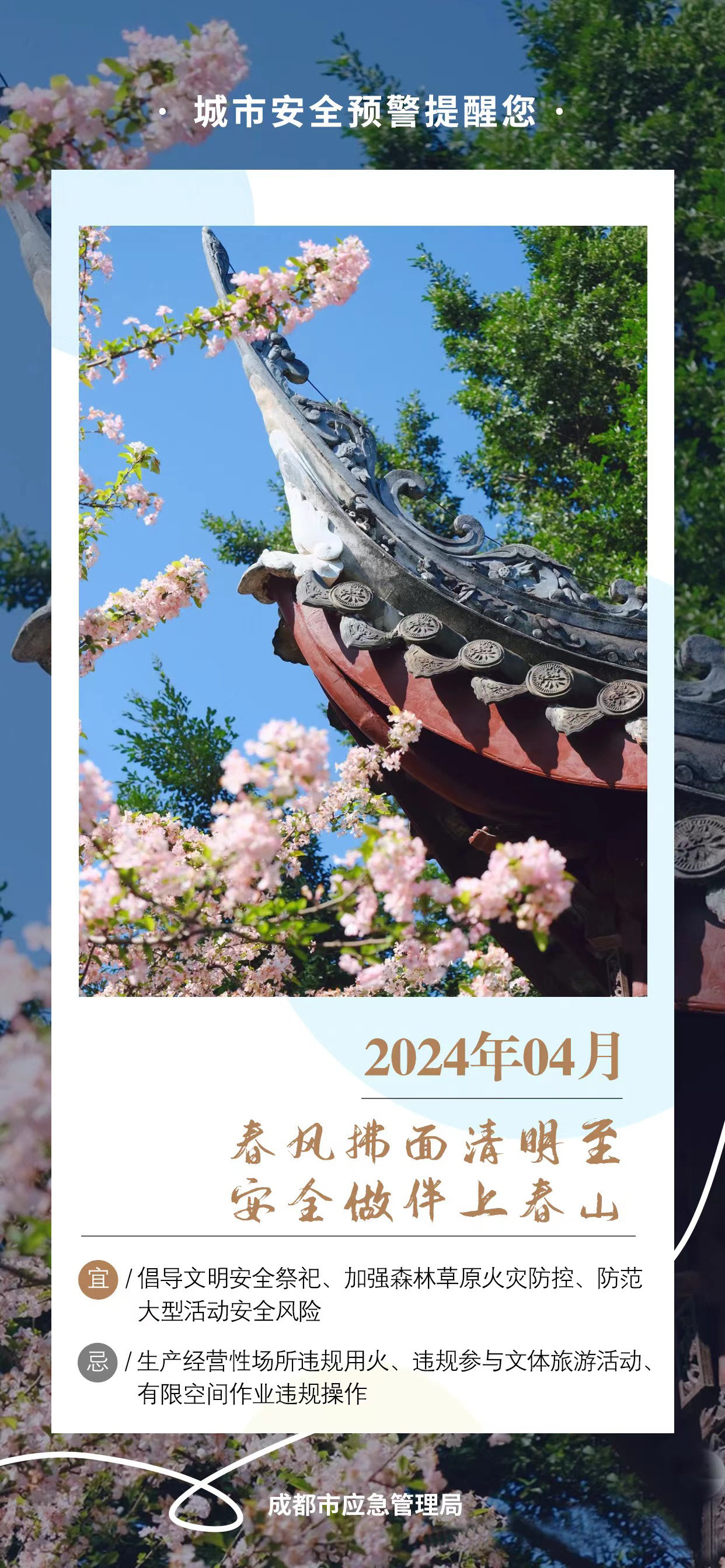 4月,春暖花开,草长莺飞,成都将迎来多场活动、赛事。4月1日,成都市安办提醒生产经营单位和市民,注意做好安全风险防范。