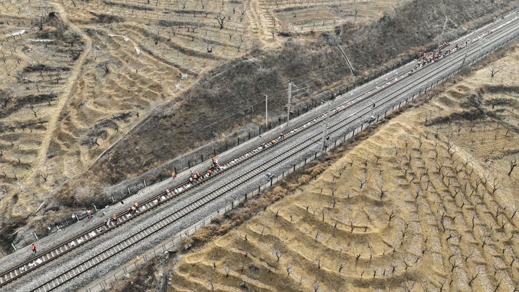 4月1日,工人在河北省遵化市境内的大秦铁路进行维修施工(无人机照片)。