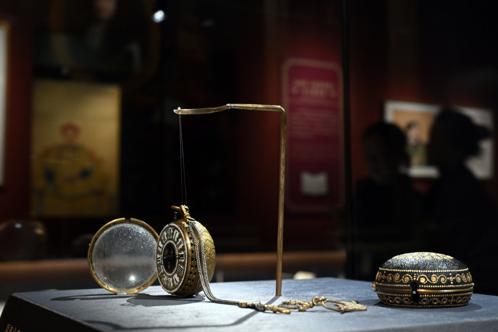 这是展出的故宫博物院藏铜镀金壳开光人物像怀表(4月1日摄)。