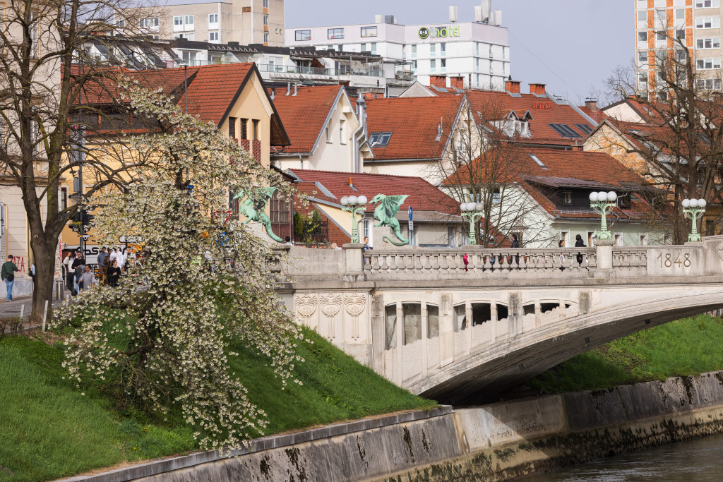 3月30日,春花在斯洛文尼亚首都卢布尔雅那的河岸盛开。
