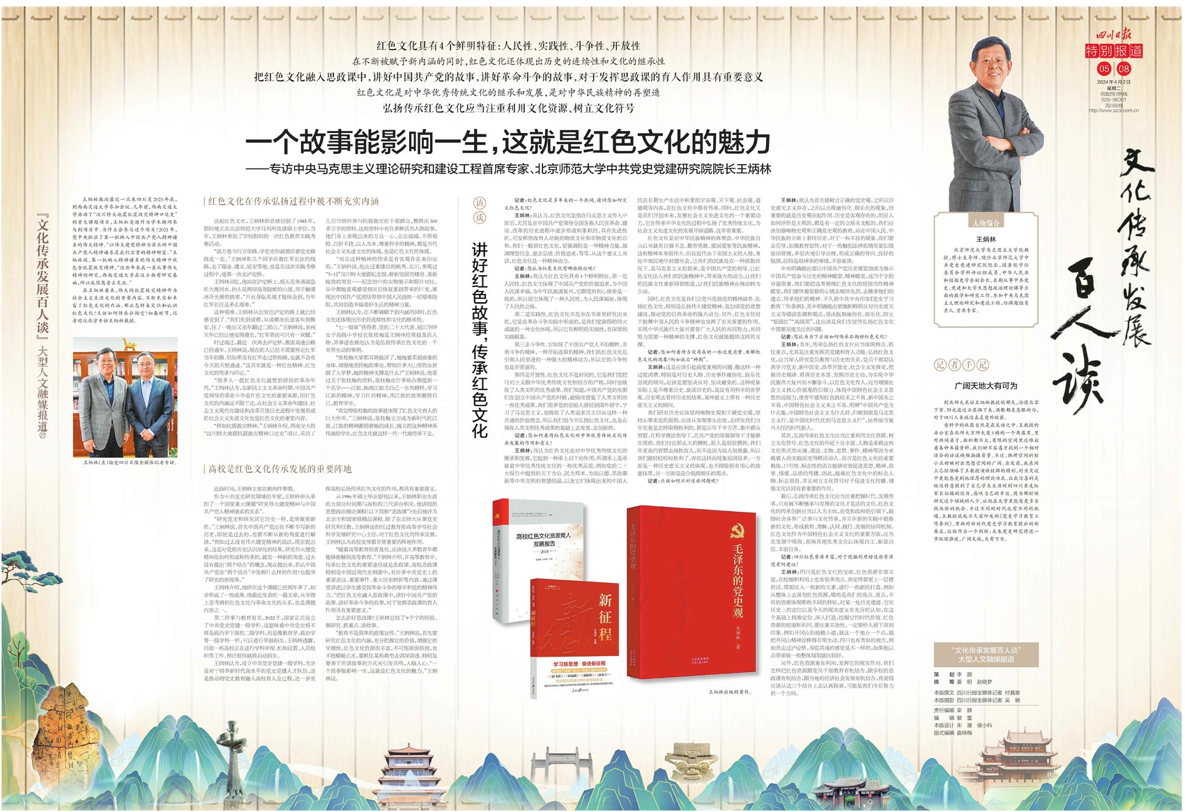 四川日报全媒体“文化传承发展百人谈”大型人文融媒报道持续推出,今日《四川日报》连版推出第二十七期,专访中央马克思主义理论研究和建设工程首席专家、北京师范大学中共党史党建研究院院长王炳林。他认为,红色文化具有4个鲜明特征:人民性、实践性、斗争性、开放性;在不断被赋予新内涵的同时,红色文化还体现出历史的连续性和文化的继承性;把红色文化融入到思政课中,讲好中国共产党的故事,讲好革命斗争的故事,对于发挥思政课的育人作用具有重要意义;红色文化是对中华优秀传统文化的继承和发展,对中华民族精神的再塑造;弘扬传承红色文化应当注重利用文化资源、树立文化符号。