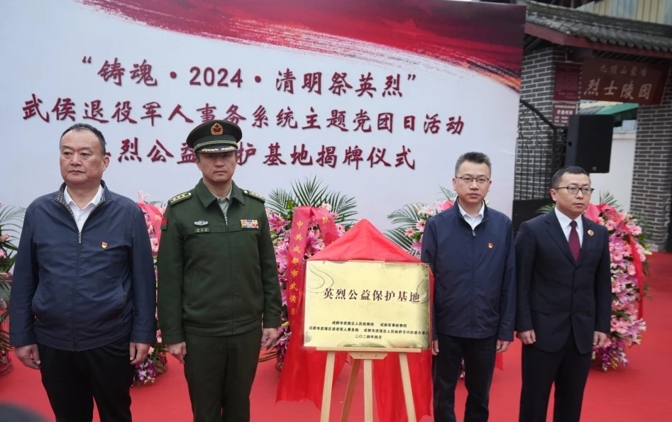 为充分发挥烈士纪念设施褒扬英烈、教育后人的红色资源作用,近日,成都军事检察院、武侯区检察院、武侯区退役军人事务局、武侯区华兴街道办事处在九顶山蒙难烈士陵园共同设立英烈公益保护基地。