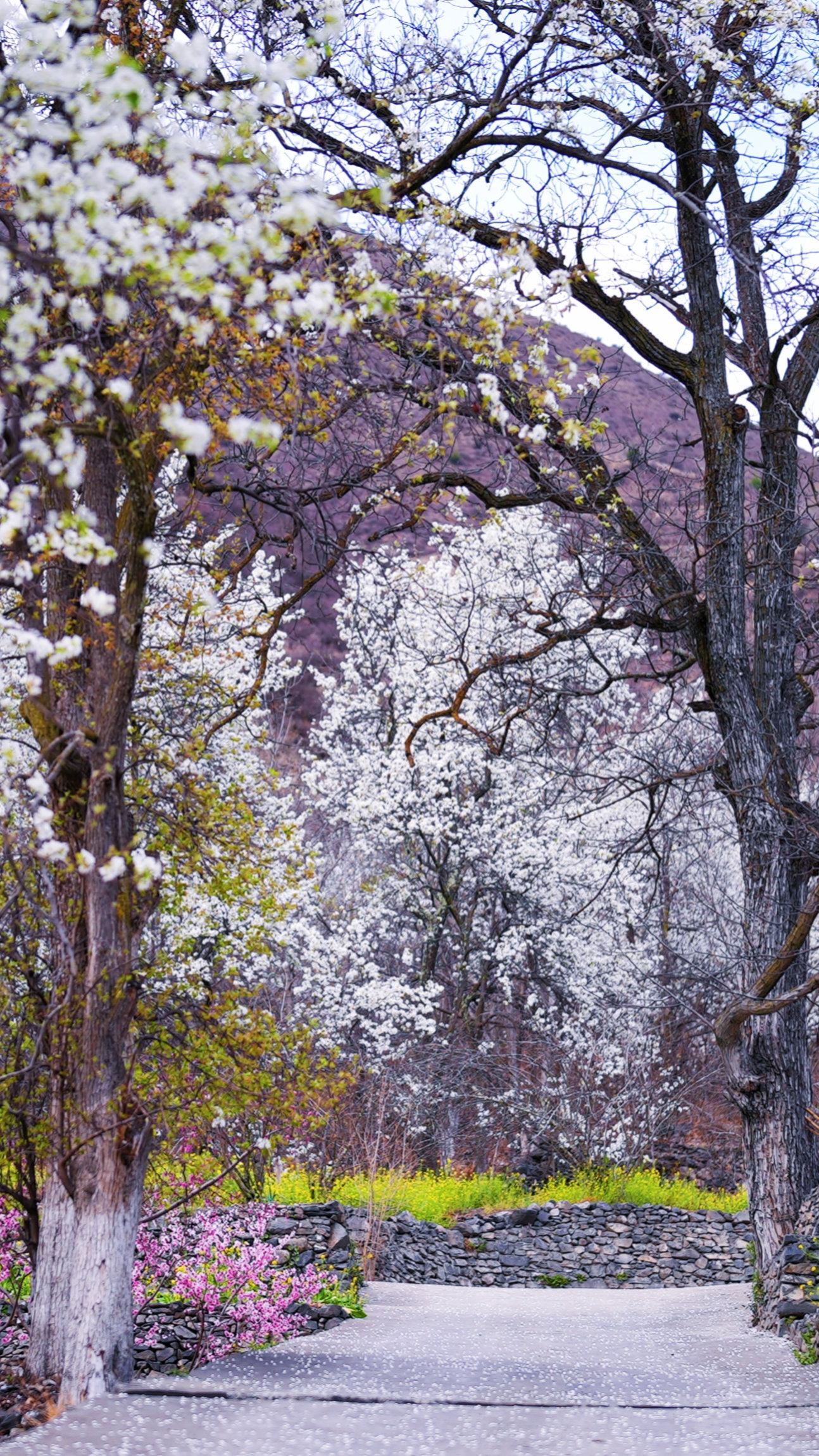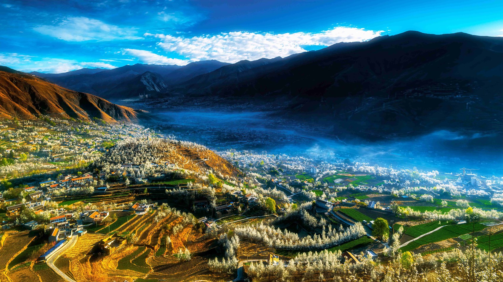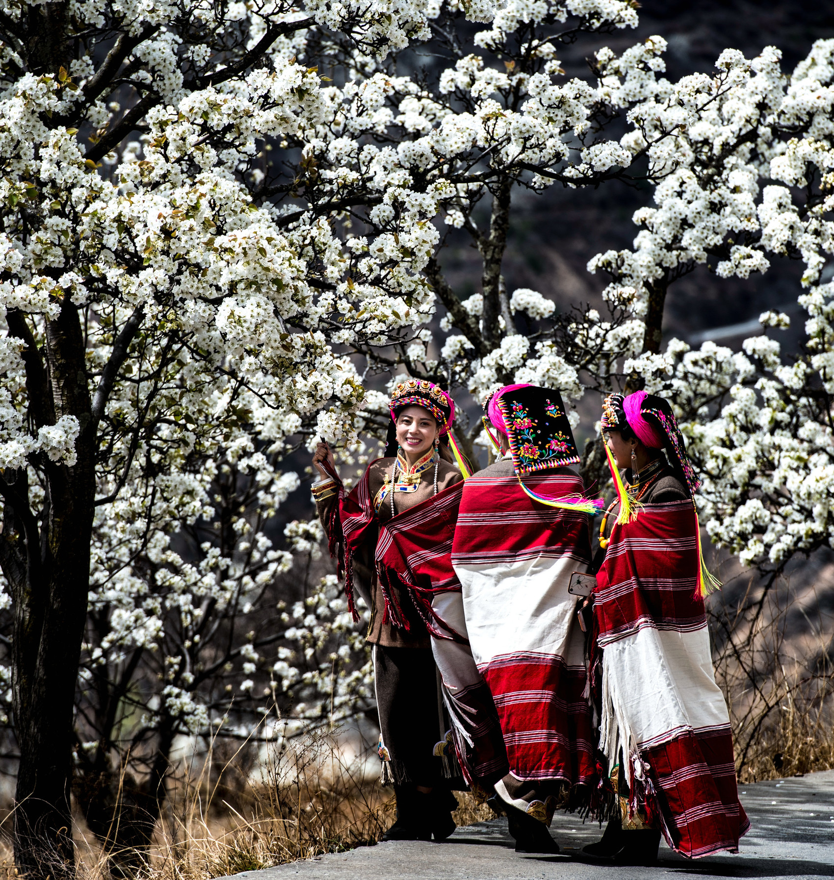 阳春三月,阿坝藏族羌族自治州金川河谷的万亩梨花一夜之间傲然绽放。河水奔流、梨花晶莹、麦地碧绿、天空湛蓝,这是一幅美丽恬淡的世外梨园。