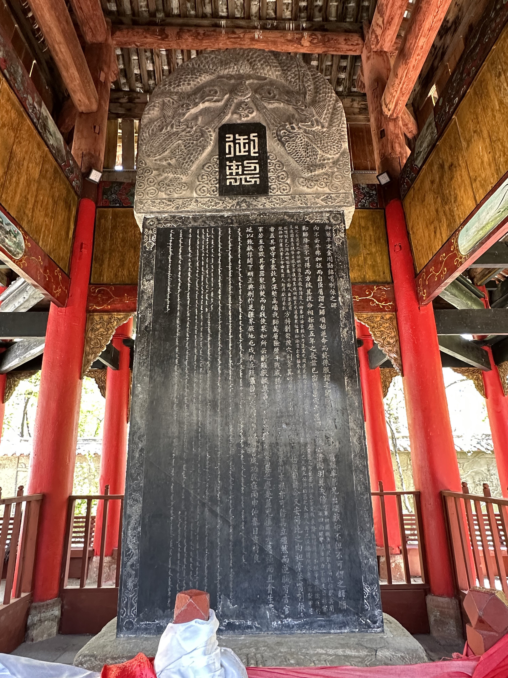 跨入碑亭,一座黑漆漆的高大石碑闯入眼前。历经200多年风霜,由花岗石錾刻的石碑依然保存完好。碑身高4.50米,宽2米,厚1.30米,上面篆有汉、满、藏、蒙四种文字;宝顶同样由花岗石錾制,雕刻“二龙戏珠”浮雕图案;碑下有一座,高0.80米,长4.30米,宽2米。凑近细看,这块重达数吨的巨石记载了乾隆皇帝两次用兵金川的征战史,透过錾刻的碑文,以及乾隆御碑“一号讲解员”张诗茂生动的讲述,200多年前大小金川之战越过时空重新变得生动。