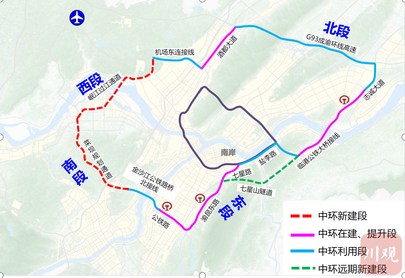 从建设步骤来看,中环线的建设将按照先贯通后提升的原则,利用现有的G93成渝环线高速、机场东连接线、宜屏快速通道等路段以及正在建设的酒都大道、临港公铁大桥南北连接线等部分,新建岷江过江通道及菜坝规划通道,共同形成全长66公里的环形通道,预计2027年底前全线建成通车。