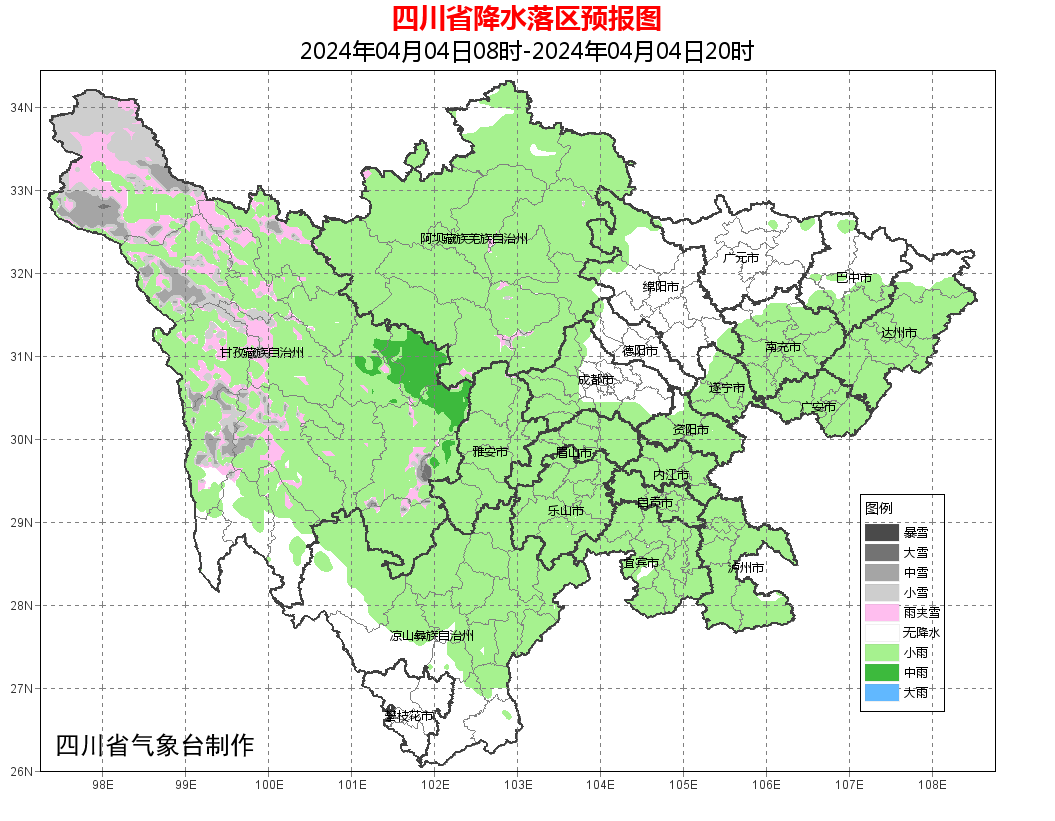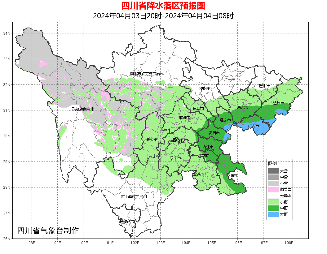 明天白天:盆地各市阴天间多云,部分地方有阵雨或小雨;甘孜州西南部和攀西地区西部南部多云间晴,川西高原和攀西地区其余地方阴天间多云有阵雨(雪),局部有中雨。