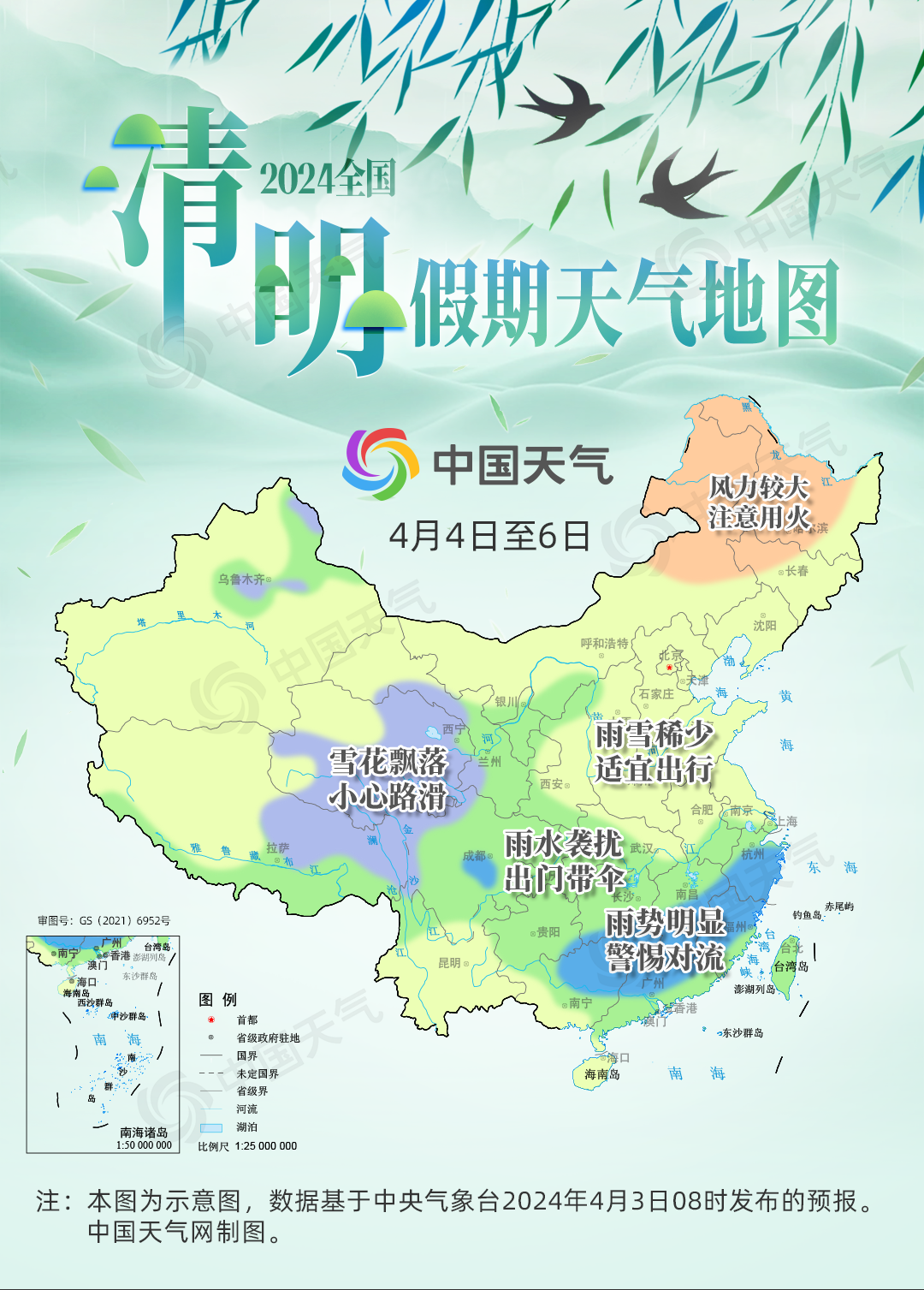 今年清明假期,我国不少地区将上演“清明时节雨纷纷”的场景。假期期间,南方有大范围降雨,局地伴有对流性天气;北方有冷空气活动,新疆多地将迎气温波动,华北、东北雨雪稀少,天气宜出行。